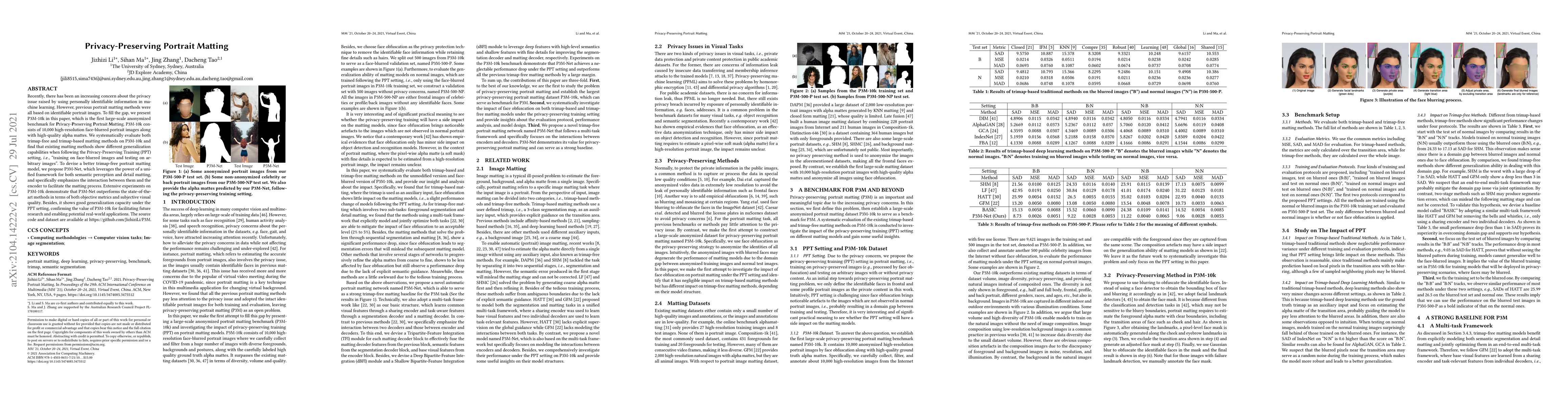 This paper introduces P3M-10k, a large-scale anonymized benchmark for privacy-preserving portrait matting, consisting of 10,000 face-blurred images and alpha mattes. It proposes P3M-Net, a unified framework that outperforms existing methods under Privacy-Preserving Training, demonstrating better generalization and visual quality.