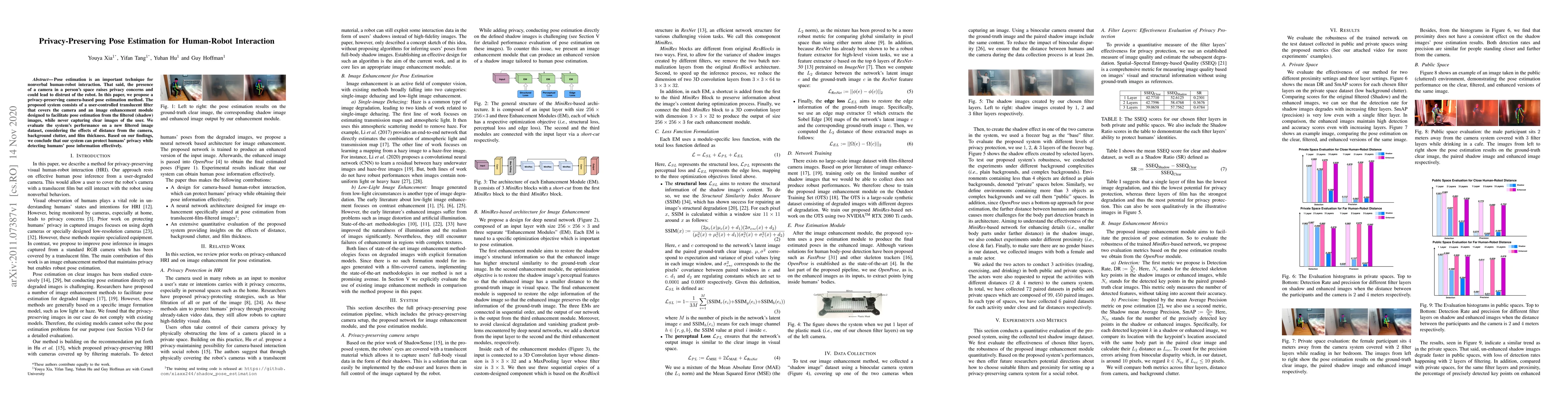 This paper proposes a privacy-preserving method for camera-based pose estimation in human-robot interaction, using a user-controlled translucent filter and an image enhancement module to detect poses without capturing clear images of individuals. The system's effectiveness is evaluated on a new filtered image dataset, demonstrating its ability to protect privacy while accurately detecting human poses.