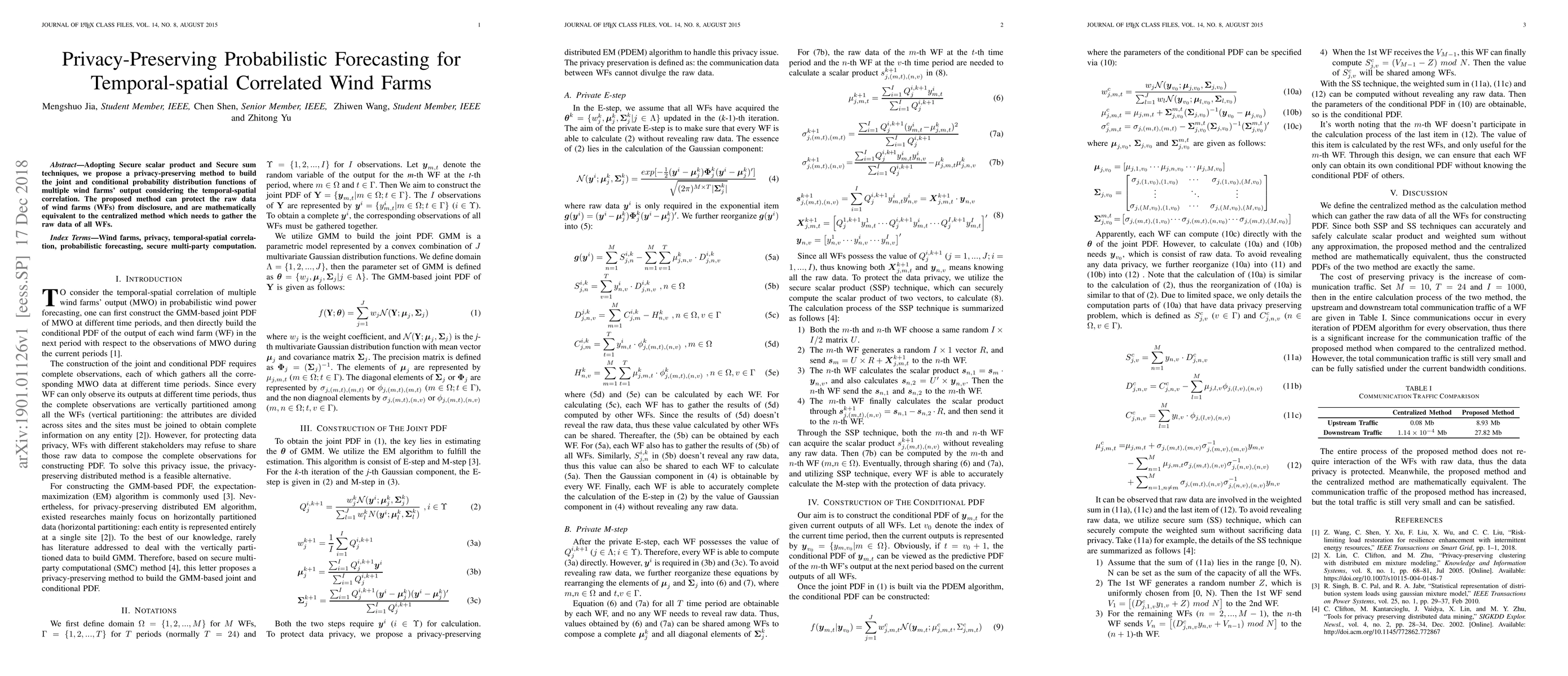 Summary: This paper introduces a privacy-preserving method for probabilistic forecasting of wind farms' output, leveraging secure scalar and sum techniques to maintain data confidentiality while preserving temporal-spatial correlations. The method ensures raw data protection and mathematical equivalence to centralized approaches.