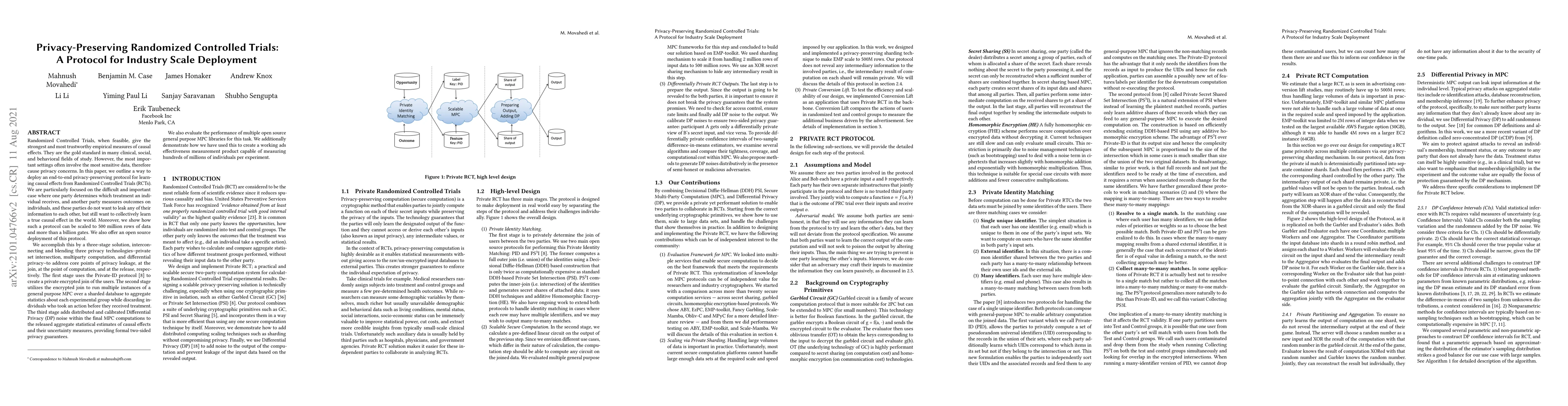 This paper proposes a three-stage protocol for conducting privacy-preserving Randomized Controlled Trials (RCTs) on a massive scale, leveraging Private Secret Share Set Intersection, multi-party computation, and Differential Privacy. The protocol enables secure analysis of data from multiple parties without compromising individual privacy, demonstrated through a working product for measuring ad effectiveness.