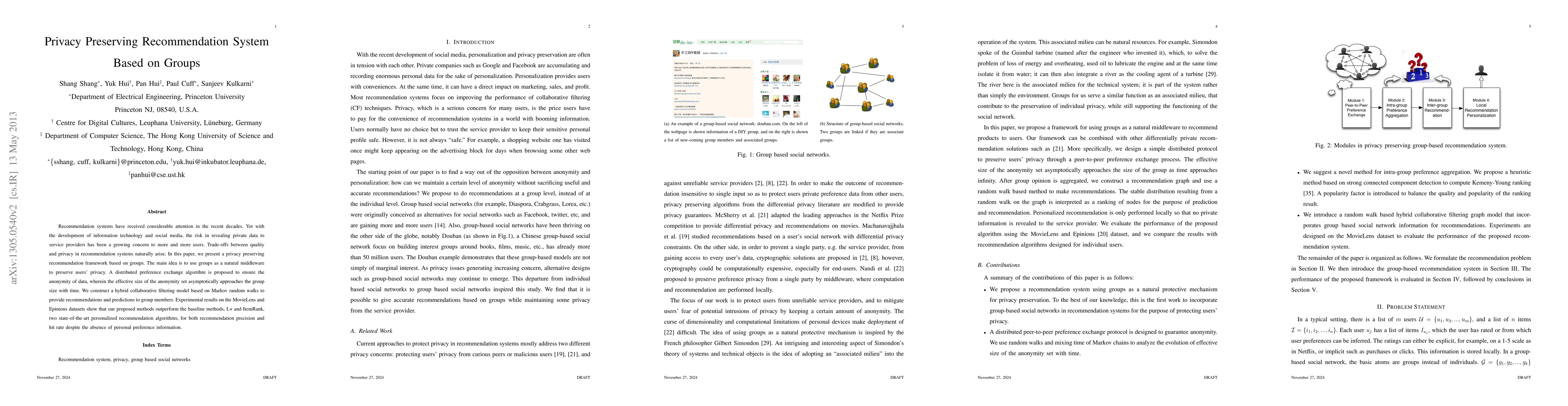 This paper proposes a privacy-preserving recommendation system using groups as a middleware to protect user data. The system employs a distributed preference exchange algorithm to ensure anonymity and a hybrid collaborative filtering model based on Markov random walks for recommendations, outperforming baseline methods in precision and hit rate.