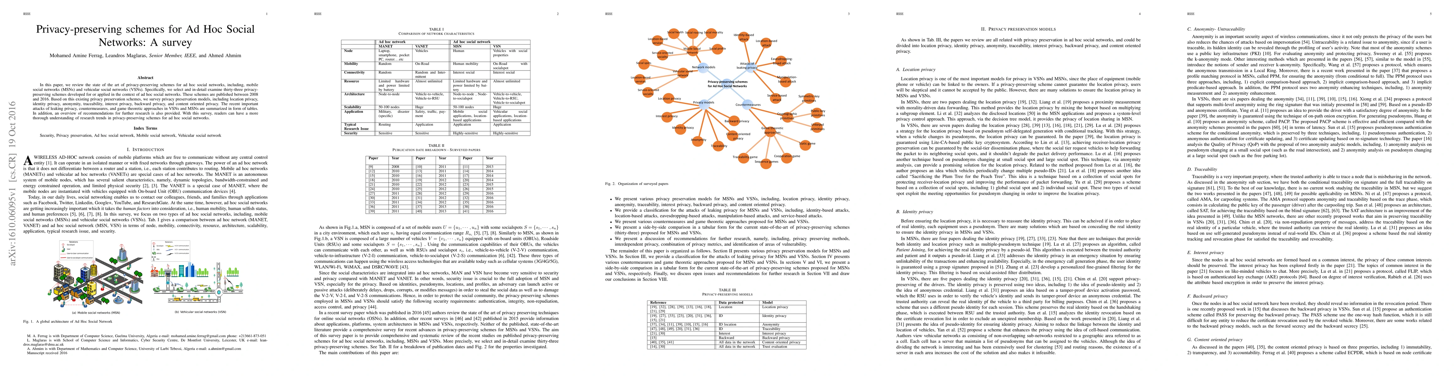 This paper surveys privacy-preserving schemes for ad hoc social networks, including mobile and vehicular social networks, focusing on models like location, identity, and interest privacy. It analyzes thirty-three schemes published between 2008 and 2016, summarizing recent privacy attacks, countermeasures, and future research recommendations.