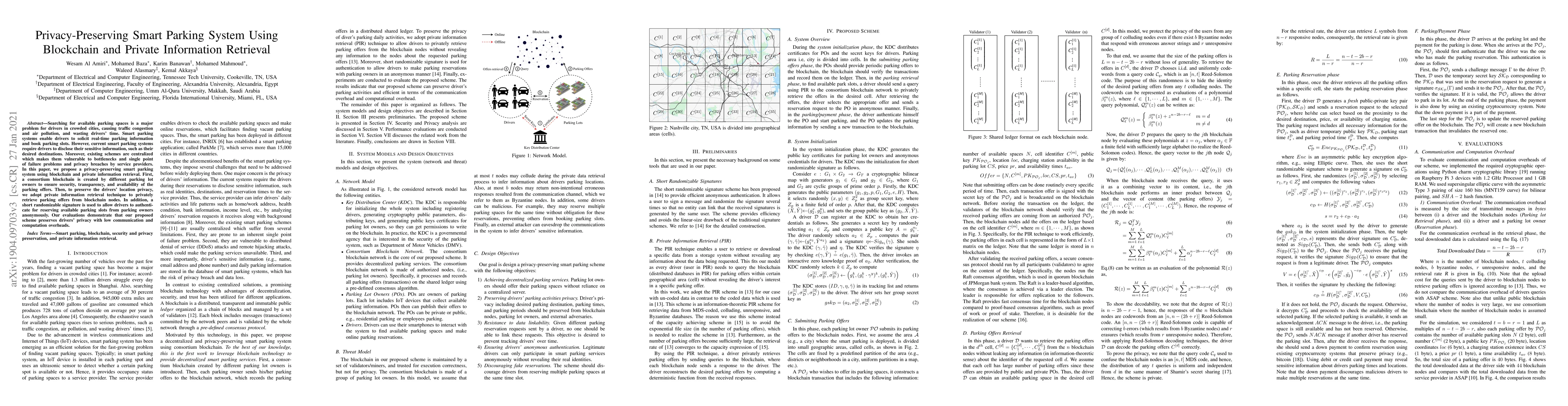 A novel approach combining private information retrieval with blockchain technology was employed to ensure security, transparency, and availability of parking data.