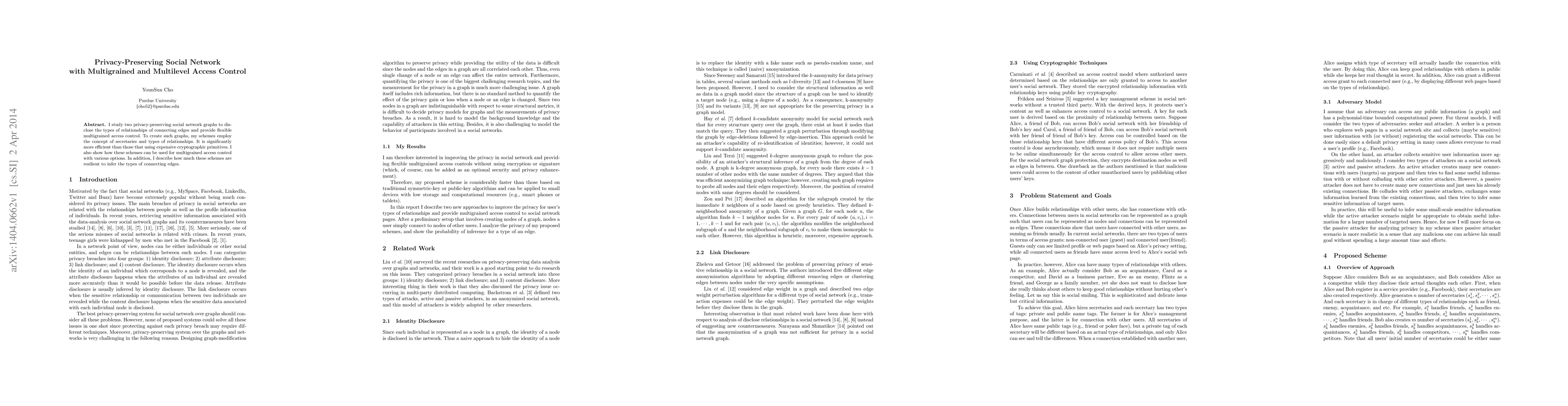 I study two privacy-preserving social network graphs to dis- close the types of relationships of connecting edges and provide flexible multigrained access control. To create such graphs, my schemes employ the concept of secretaries and types of relationships. It is significantly more efficient than those that using expensive cryptographic primitives. I also show how these schemes can be used for multigrained access control with various options. In addition, I describe how much these schemes are resilient to infer the types of connecting edges.