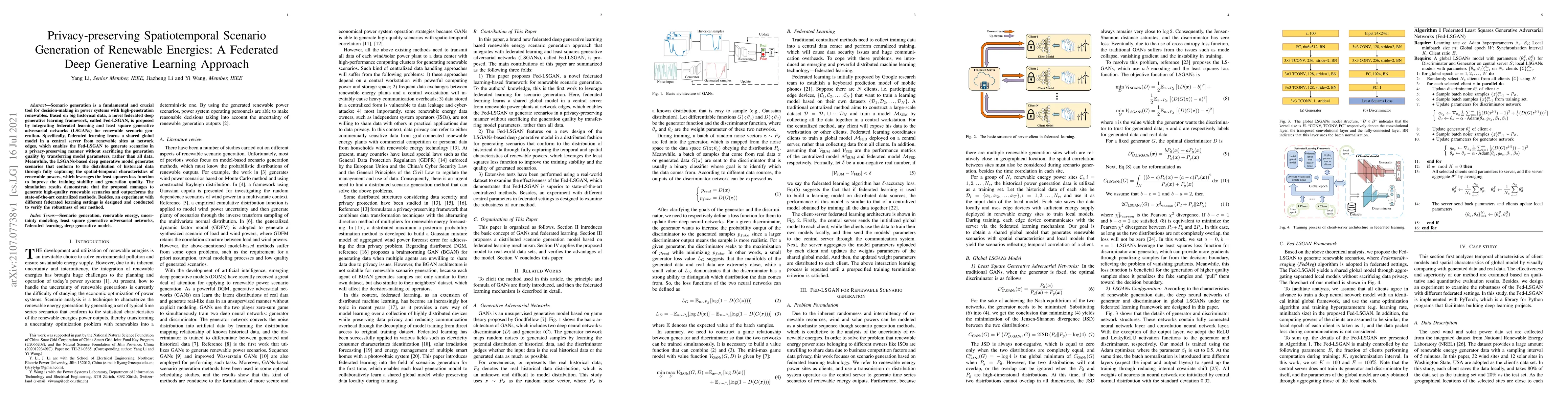This paper proposes a federated deep generative learning framework, Fed-LSGAN, to generate privacy-preserving spatiotemporal scenarios for renewable energy systems. It integrates federated learning and least square GANs to create high-quality, data-distribution conforming scenarios without compromising privacy.