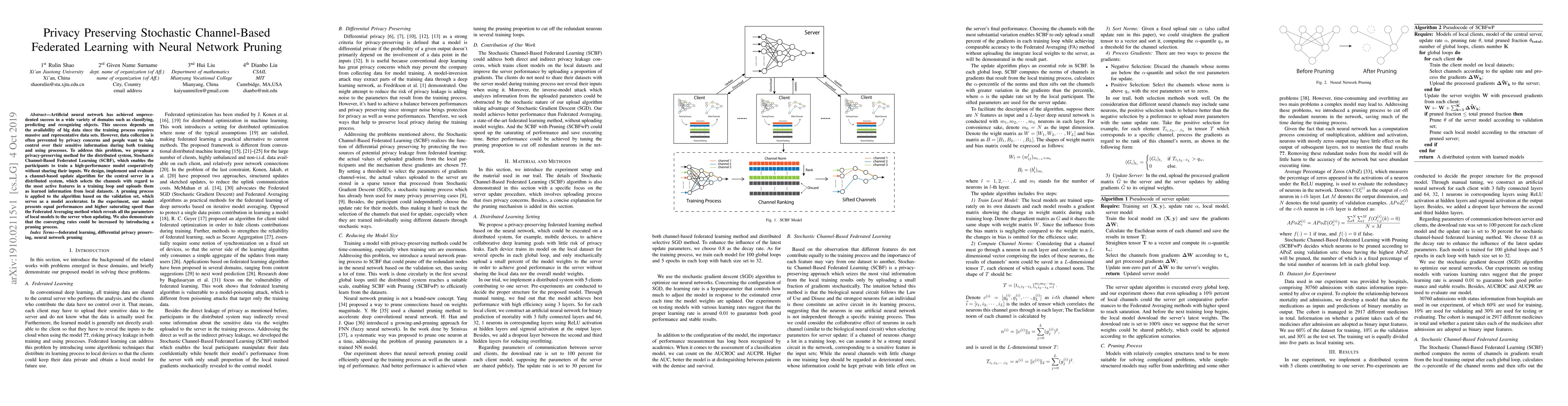 This paper proposes a privacy-preserving federated learning method called Stochastic Channel-Based Federated Learning (SCBF) that allows participants to collaboratively train neural networks without sharing their data. It introduces a pruning process to enhance model efficiency and demonstrates superior performance compared to Federated Averaging.