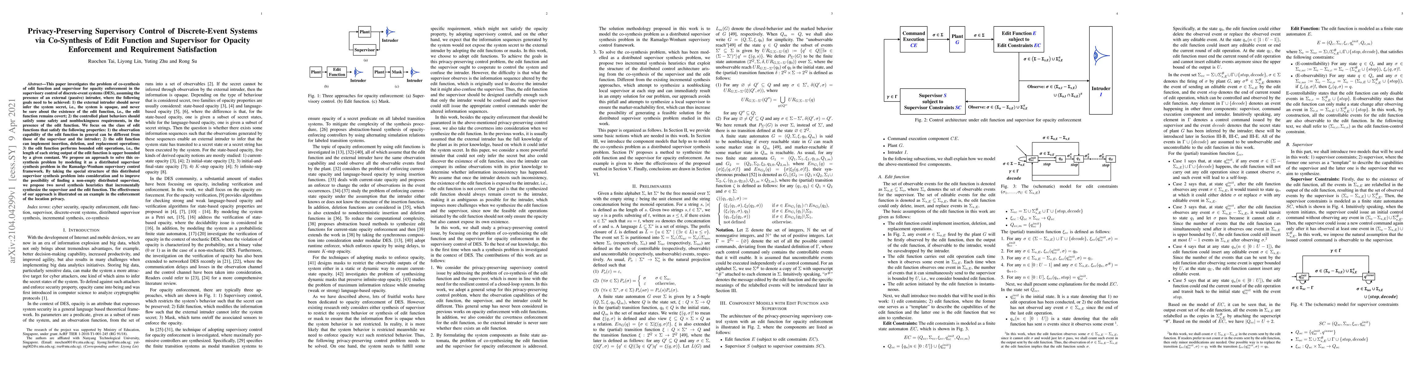 This paper proposes a method for co-synthesizing an edit function and supervisor to enforce opacity and requirement satisfaction in discrete-event systems, ensuring privacy from an external intruder while satisfying safety and nonblockingness. The approach uses heuristics to incrementally synthesize both components within the Ramadge-Wonham framework.