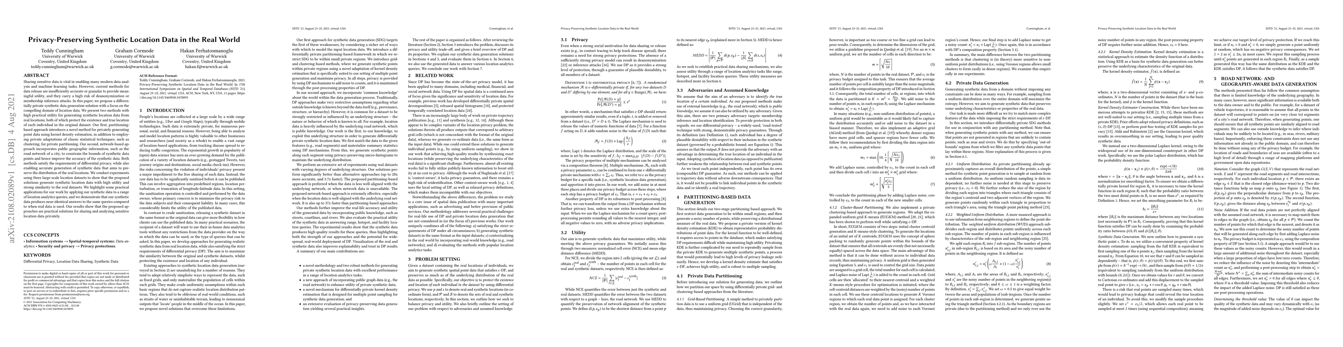 This paper proposes differentially private methods for generating synthetic location data that maintains high utility while protecting individual privacy. The proposed partitioning-based and network-based approaches use kernel density estimation and public geographic information to generate synthetic data that preserves the distribution of real locations, demonstrating strong similarity and practical applications in location analytics.