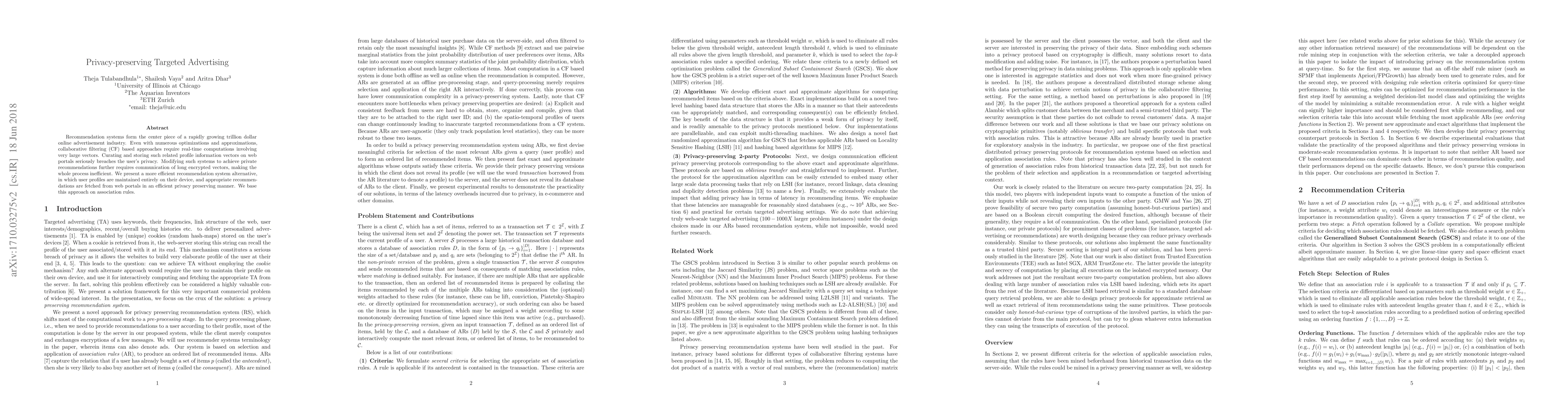 A new recommendation system method uses association rules to provide efficient privacy-preserving targeted advertising without storing user profile information on web portals.