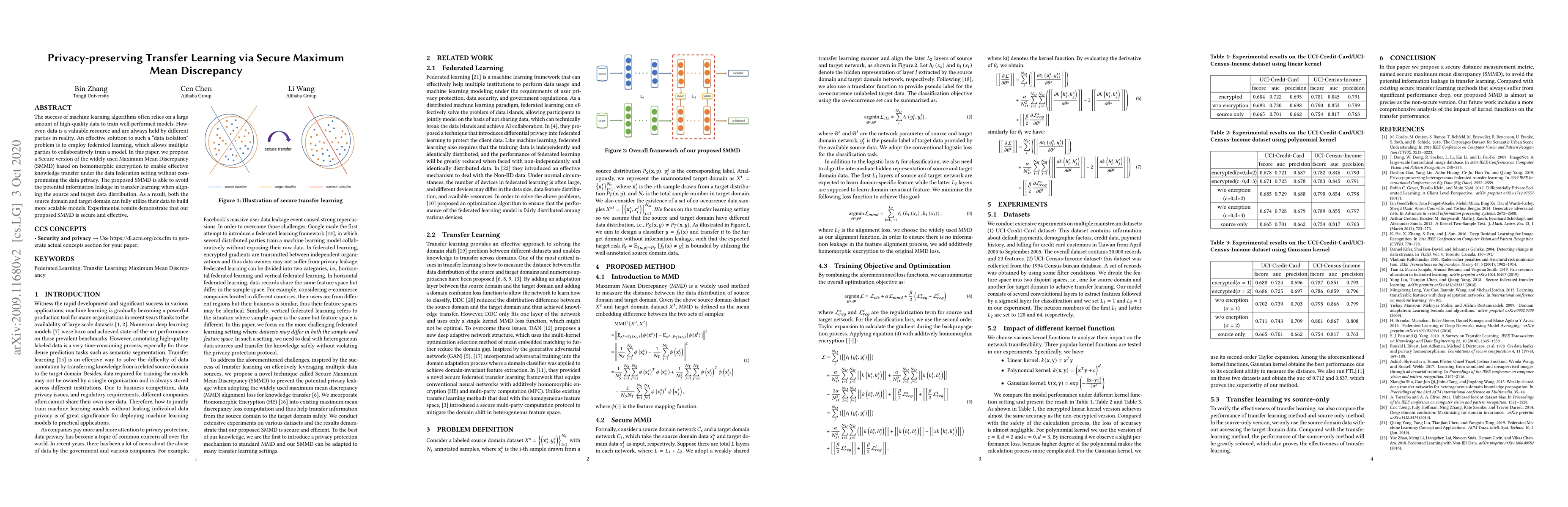 Researchers propose a secure method for data transfer learning without compromising privacy, using homomorphic encryption to protect sensitive data in federated learning settings. Their approach, called Secure Maximum Mean Discrepancy, demonstrates effective knowledge transfer while preserving source and target domain data.