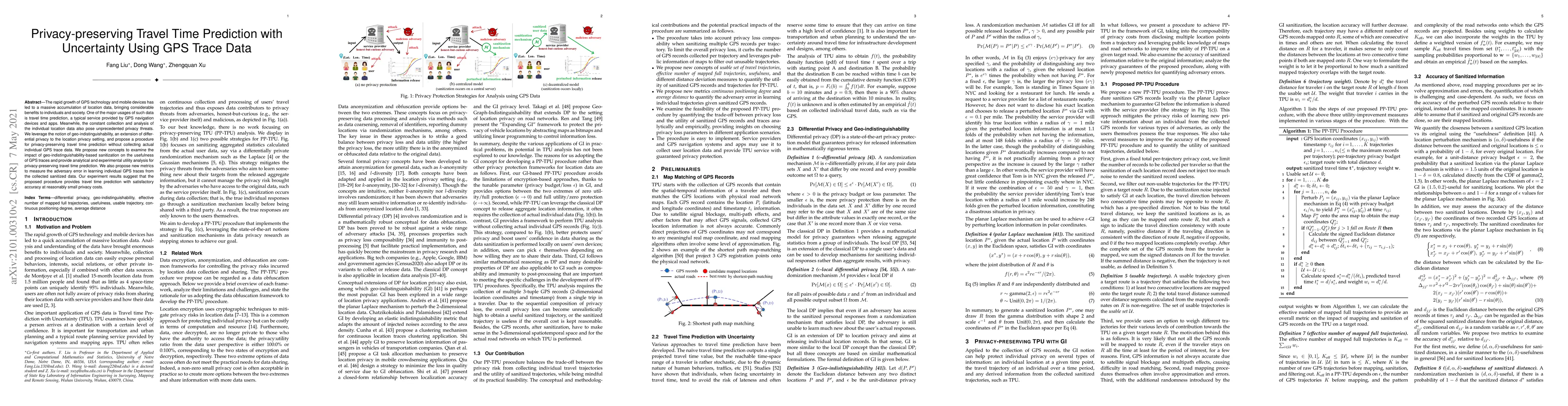 This paper proposes a method for privacy-preserving travel time prediction using GPS trace data by leveraging geo-indistinguishability, a form of differential privacy. The approach aims to balance the benefits of accurate travel time predictions with the protection of individual location data privacy.