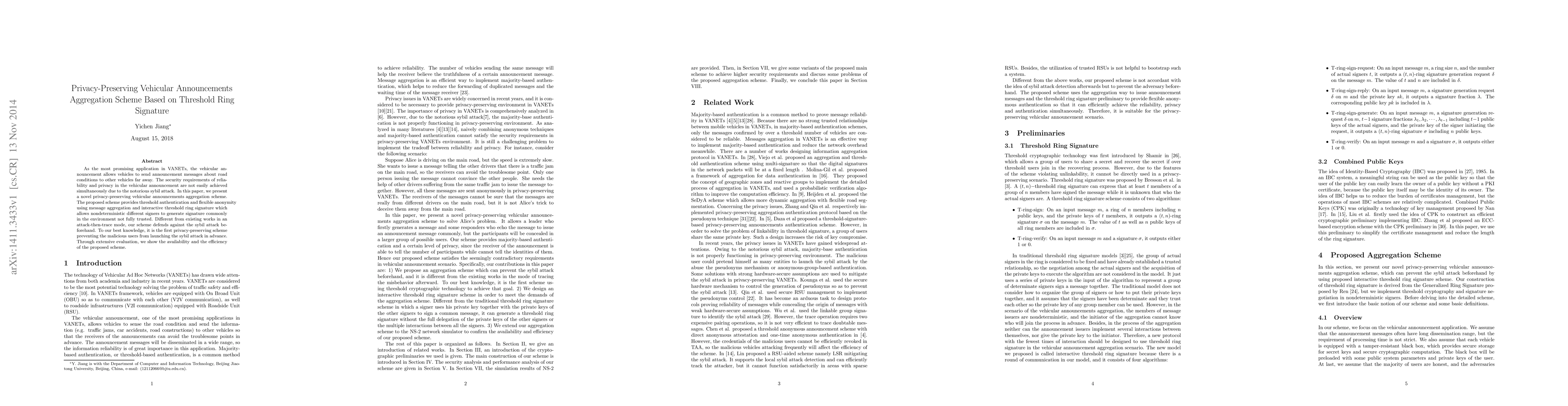 This paper introduces a novel privacy-preserving vehicular announcements aggregation scheme using threshold ring signature to address the sybil attack in VANETs. The scheme provides threshold authentication and flexible anonymity, preventing malicious users from launching sybil attacks in advance, and demonstrates its availability and efficiency.