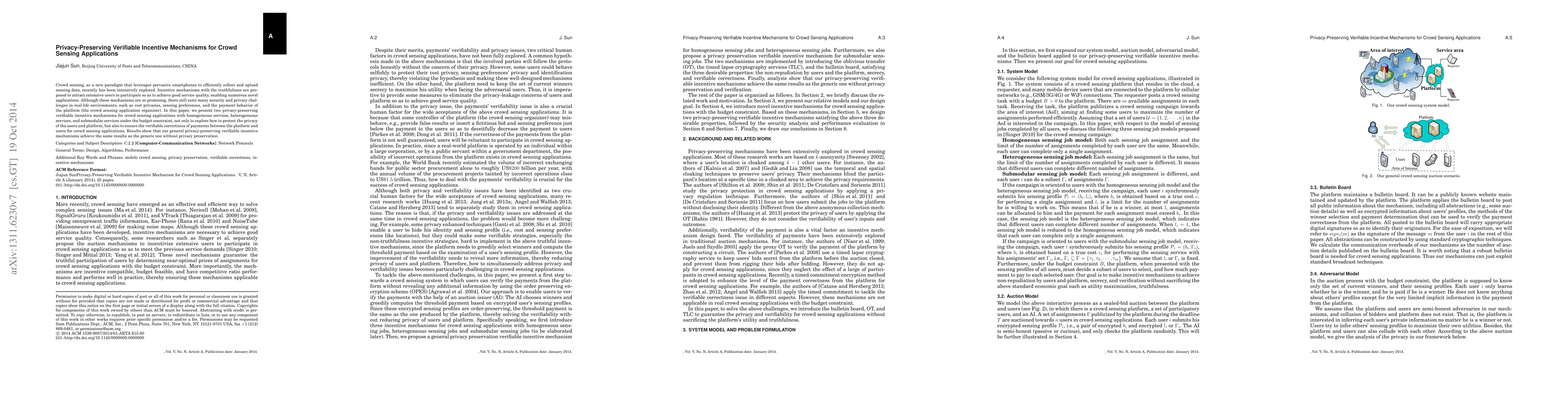 This paper proposes a privacy-preserving verifiable incentive mechanism for crowd sensing applications to ensure user and platform privacy, while maintaining correct verifiable payments within budget constraints. The proposed mechanism addresses privacy challenges and achieves comparable results to non-privacy-preserving methods.