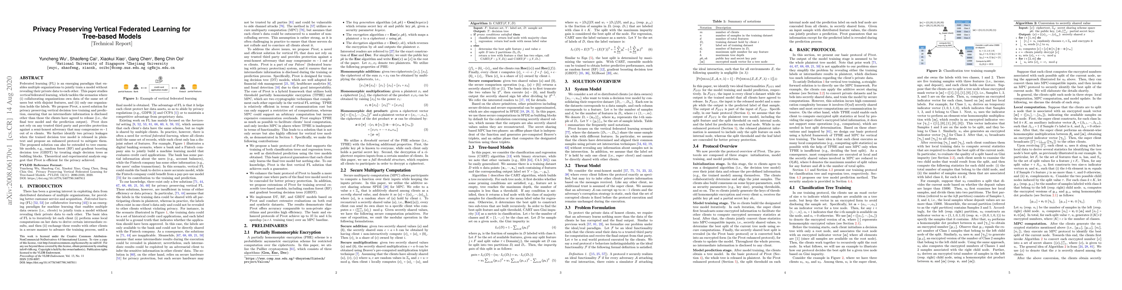 This paper introduces Pivot, a novel privacy-preserving solution for vertical federated learning of tree-based models, ensuring no intermediate data is disclosed. Pivot provides protection against semi-honest adversaries and can be extended to ensemble models like random forests and gradient boosting decision trees.