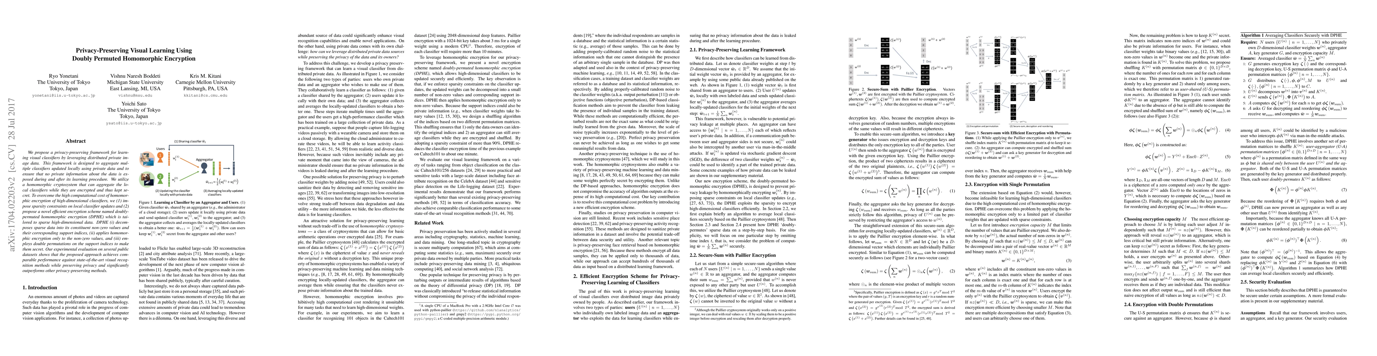 This paper proposes a privacy-preserving framework for learning visual classifiers using doubly permuted homomorphic encryption (DPHE) to efficiently handle sparse high-dimensional data. The method ensures no private information is exposed during the learning process while achieving comparable performance to state-of-the-art visual recognition methods.