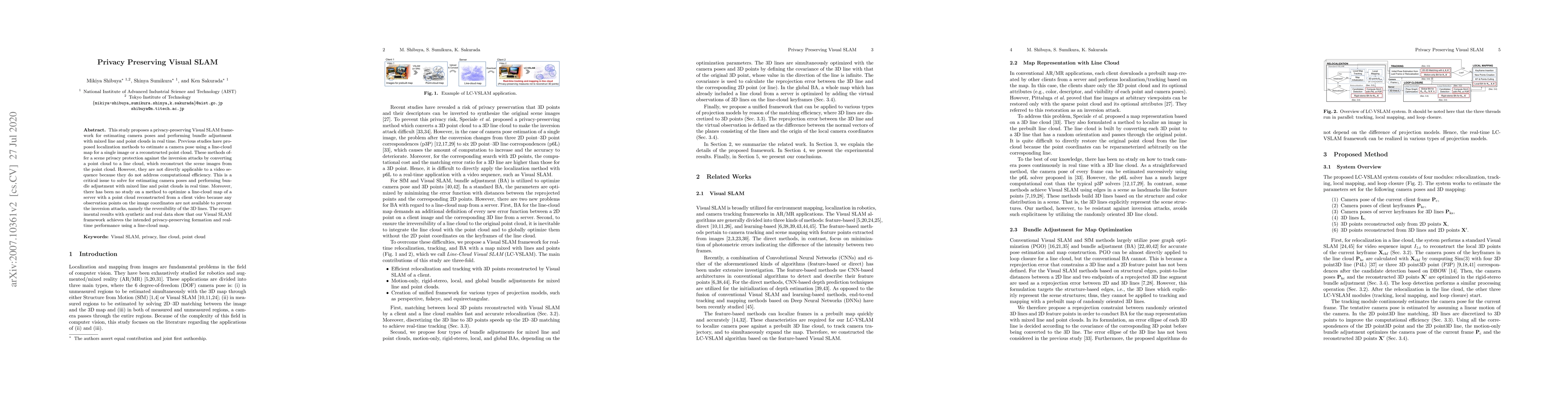 This study introduces a privacy-preserving Visual SLAM framework that estimates camera poses and performs real-time bundle adjustment using mixed line and point clouds. The proposed method addresses computational efficiency for video sequences and optimizes a line-cloud map to protect scene privacy, achieving both intended privacy and real-time performance.