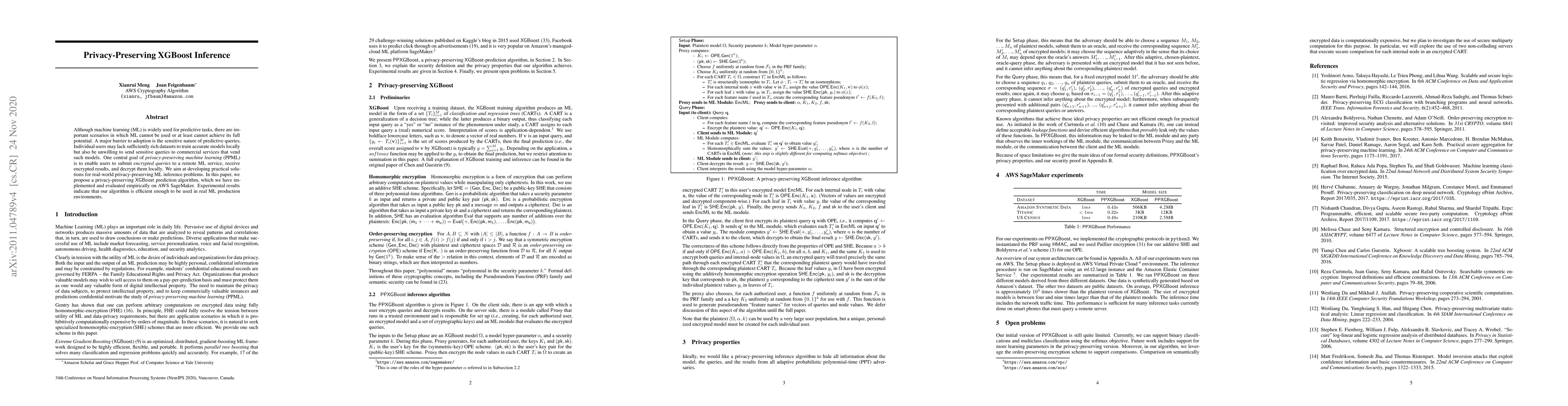 This paper proposes a privacy-preserving XGBoost prediction algorithm to enable secure, encrypted ML inference without compromising data privacy. The algorithm was implemented and evaluated on AWS SageMaker, demonstrating sufficient efficiency for real-world production environments.