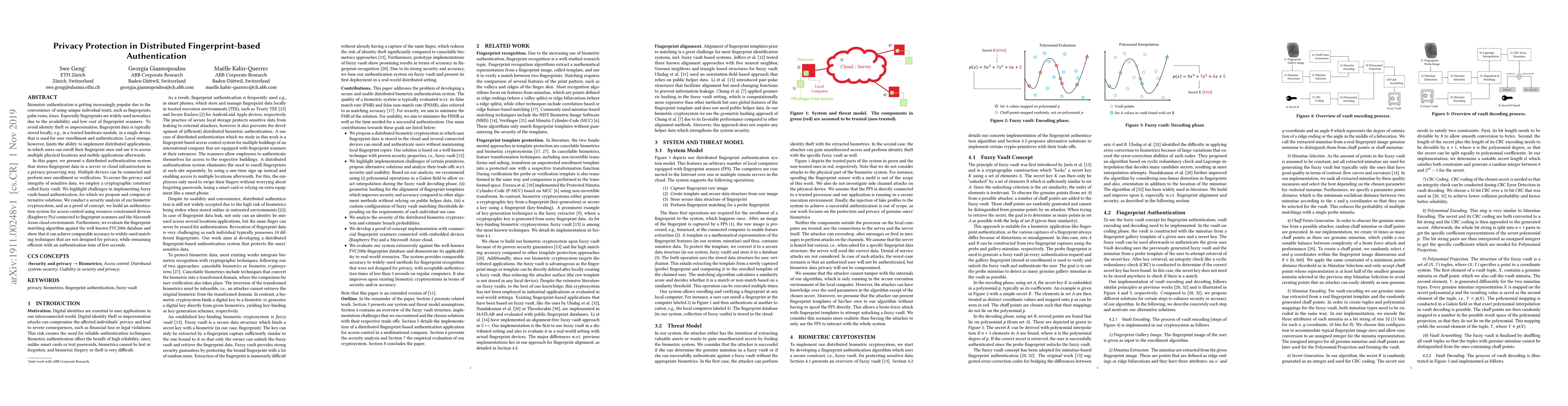 This paper proposes a distributed fingerprint-based authentication system using a privacy-preserving cryptographic construct called fuzzy vault to securely store fingerprint data in a cloud infrastructure. The system enables multiple devices to perform enrollment and verification while maintaining data integrity and privacy, and it demonstrates comparable accuracy with existing techniques.