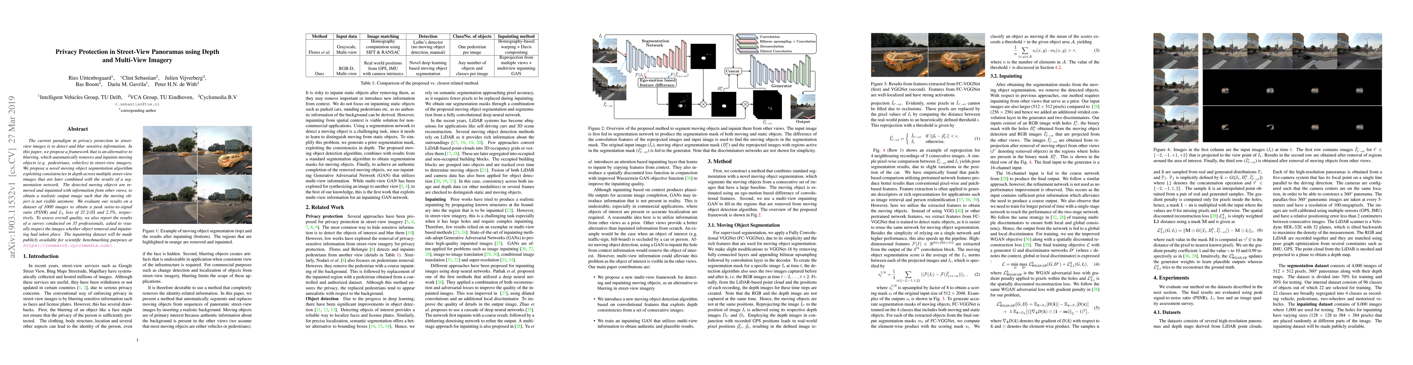This paper proposes a framework for privacy protection in street-view panoramas by automatically detecting and removing moving objects, which are then inpainted using depth and multi-view imagery. The method achieves a PSNR of 27.2 dB and an L1 loss of 2.5%, and is validated through a survey of 35 professionals.