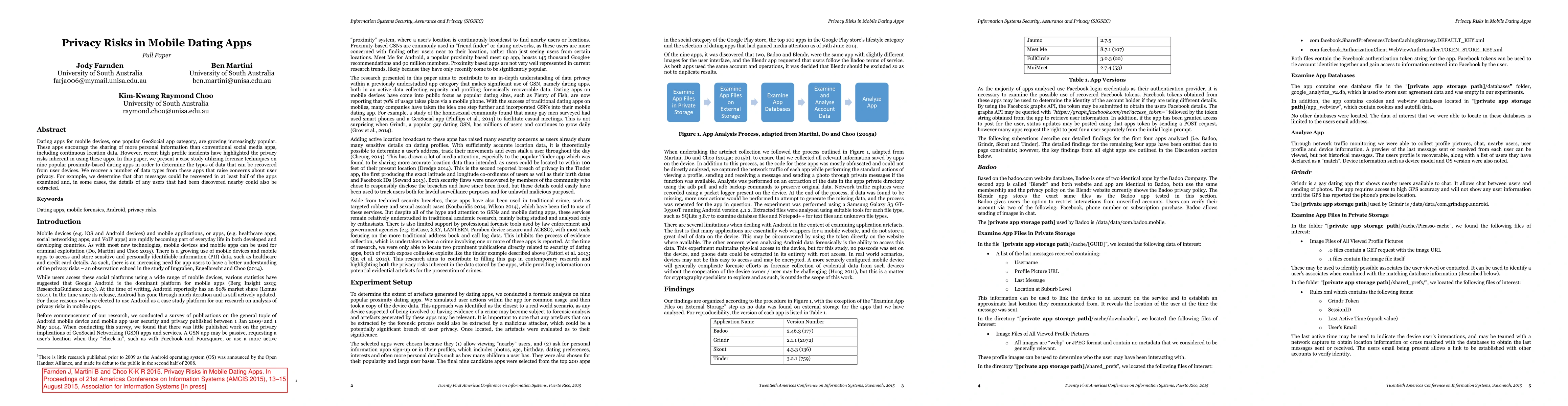 This paper investigates privacy risks in popular mobile dating apps by employing forensic techniques on nine proximity-based apps. It reveals that sensitive data, including chat messages and nearby user details, can often be recovered from user devices, raising significant privacy concerns.