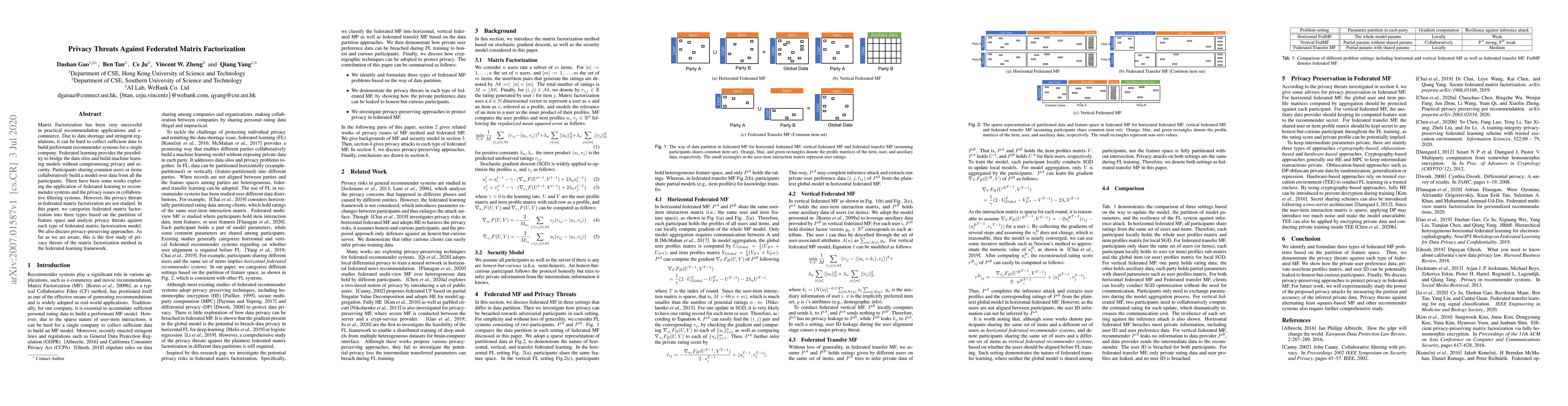 This paper investigates the privacy threats associated with federated matrix factorization, a method used in collaborative filtering systems within federated learning frameworks. It categorizes federated matrix factorization into three types based on feature space partitioning and analyzes the privacy risks inherent in each type, along with discussing potential privacy-preserving approaches.