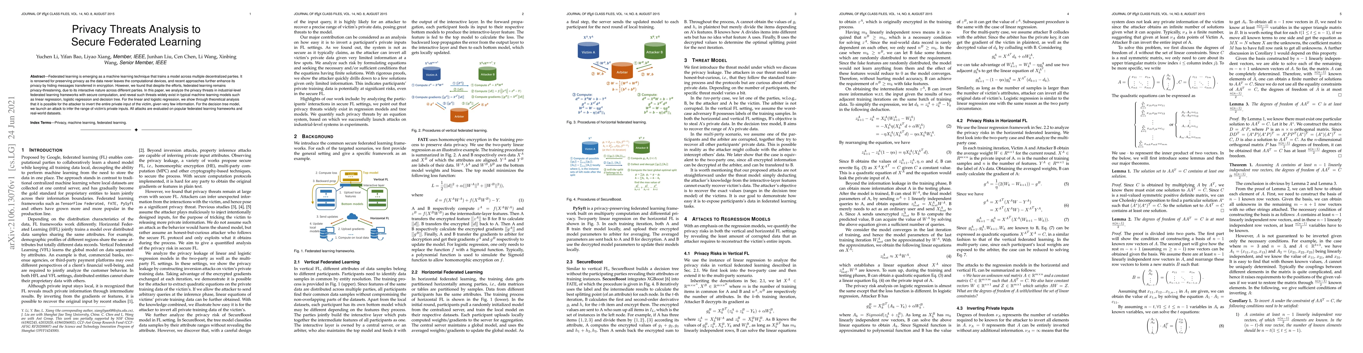 This paper analyzes privacy threats in federated learning frameworks, revealing vulnerabilities despite encryption. It demonstrates that attacks can invert private inputs for linear and logistic regression models and infer input ranges for decision trees, evaluated on popular frameworks and real datasets.