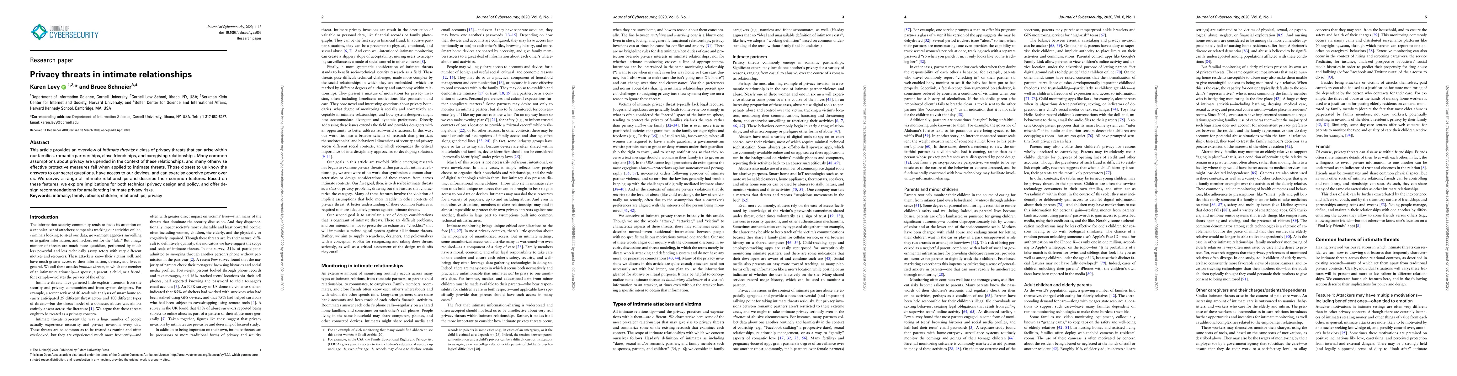 This paper examines privacy threats within intimate relationships, highlighting how traditional privacy measures often fail due to the unique dynamics of trust and access in these contexts. It proposes technical and policy recommendations to mitigate these specific privacy risks, emphasizing the need for tailored approaches.