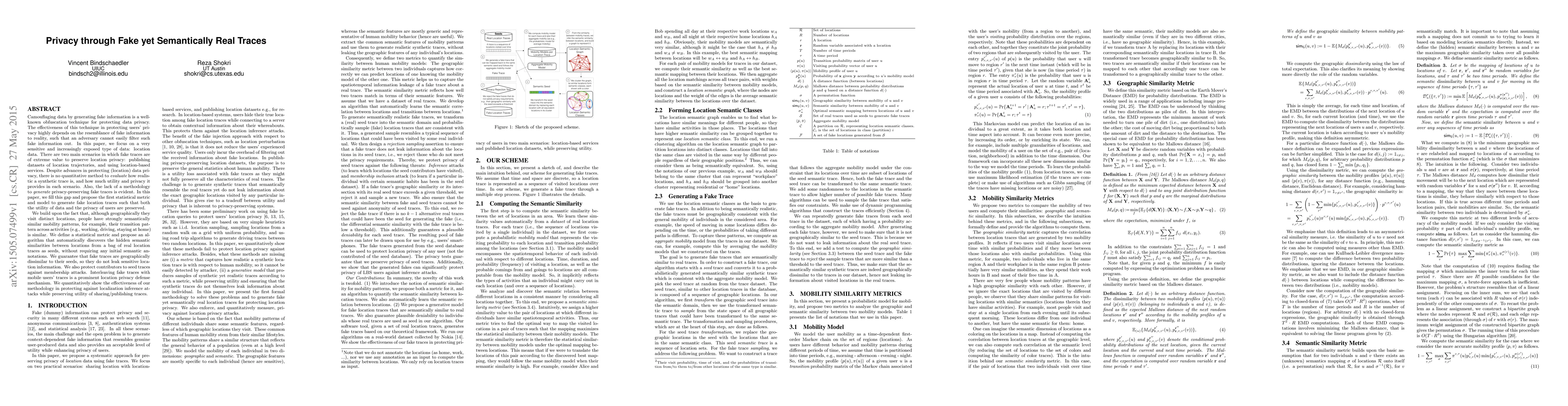Camouflaging data by generating fake information is a well-known obfuscation technique for protecting data privacy. In this paper, we focus on a very sensitive and increasingly exposed type of data: location data. There are two main scenarios in which fake traces are of extreme value to preserve location privacy: publishing datasets of location trajectories, and using location-based services. Despite advances in protecting (location) data privacy, there is no quantitative method to evaluate how realistic a synthetic trace is, and how much utility and privacy it provides in each scenario. Also, the lack of a methodology to generate privacy-preserving fake traces is evident. In this paper, we fill this gap and propose the first statistical metric and model to generate fake location traces such that both the utility of data and the privacy of users are preserved. We build upon the fact that, although geographically they visit distinct locations, people have strongly semantically similar mobility patterns, for example, their transition pattern across activities (e.g., working, driving, staying at home) is similar. We define a statistical metric and propose an algorithm that automatically discovers the hidden semantic similarities between locations from a bag of real location traces as seeds, without requiring any initial semantic annotations. We guarantee that fake traces are geographically dissimilar to their seeds, so they do not leak sensitive location information. We also protect contributors to seed traces against membership attacks. Interleaving fake traces with mobile users' traces is a prominent location privacy defense mechanism. We quantitatively show the effectiveness of our methodology in protecting against localization inference attacks while preserving utility of sharing/publishing traces.