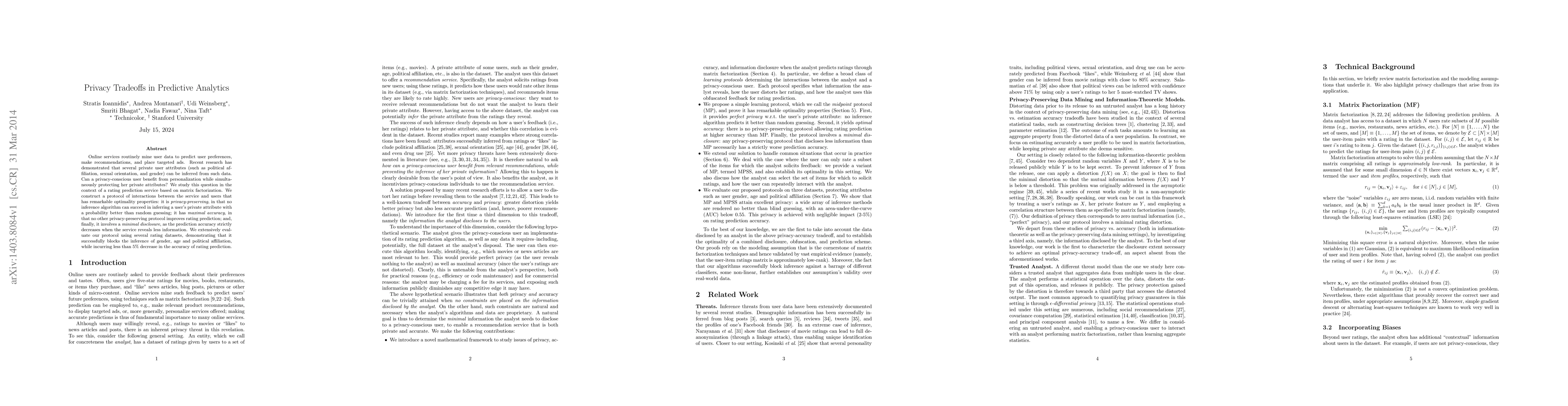 Online services routinely mine user data to predict user preferences, make recommendations, and place targeted ads. Recent research has demonstrated that several private user attributes (such as political affiliation, sexual orientation, and gender) can be inferred from such data. Can a privacy-conscious user benefit from personalization while simultaneously protecting her private attributes? We study this question in the context of a rating prediction service based on matrix factorization. We construct a protocol of interactions between the service and users that has remarkable optimality properties: it is privacy-preserving, in that no inference algorithm can succeed in inferring a user's private attribute with a probability better than random guessing; it has maximal accuracy, in that no other privacy-preserving protocol improves rating prediction; and, finally, it involves a minimal disclosure, as the prediction accuracy strictly decreases when the service reveals less information. We extensively evaluate our protocol using several rating datasets, demonstrating that it successfully blocks the inference of gender, age and political affiliation, while incurring less than 5% decrease in the accuracy of rating prediction.