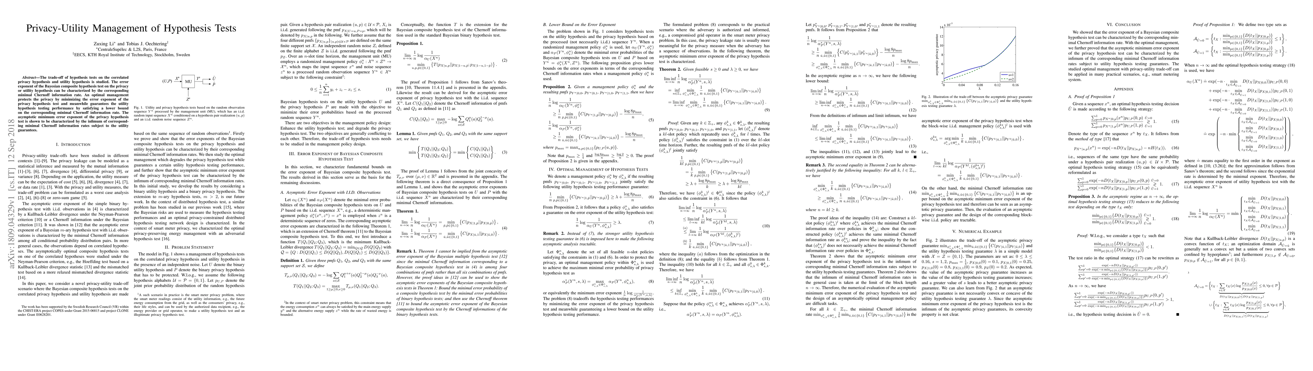 The trade-off of hypothesis tests on the correlated privacy hypothesis and utility hypothesis is studied. The error exponent of the Bayesian composite hypothesis test on the privacy or utility hypothesis can be characterized by the corresponding minimal Chernoff information rate. An optimal management protects the privacy by minimizing the error exponent of the privacy hypothesis test and meanwhile guarantees the utility hypothesis testing performance by satisfying a lower bound on the corresponding minimal Chernoff information rate. The asymptotic minimum error exponent of the privacy hypothesis test is shown to be characterized by the infimum of corresponding minimal Chernoff information rates subject to the utility guarantees.
