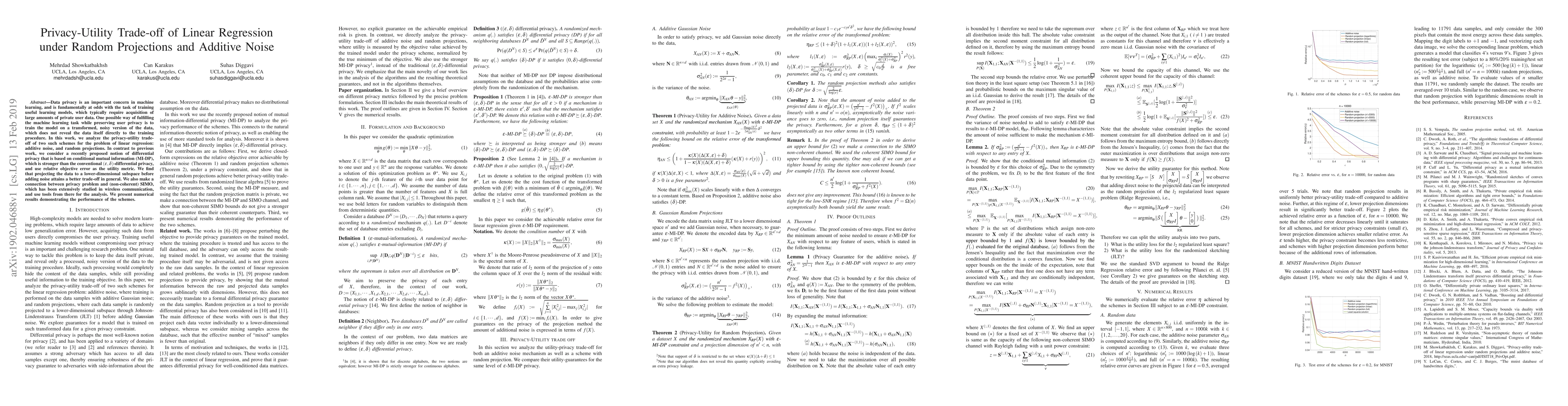 Data privacy is an important concern in machine learning, and is fundamentally at odds with the task of training useful learning models, which typically require the acquisition of large amounts of private user data. One possible way of fulfilling the machine learning task while preserving user privacy is to train the model on a transformed, noisy version of the data, which does not reveal the data itself directly to the training procedure. In this work, we analyze the privacy-utility trade-off of two such schemes for the problem of linear regression: additive noise, and random projections. In contrast to previous work, we consider a recently proposed notion of differential privacy that is based on conditional mutual information (MI-DP), which is stronger than the conventional $(\epsilon, \delta)$-differential privacy, and use relative objective error as the utility metric. We find that projecting the data to a lower-dimensional subspace before adding noise attains a better trade-off in general. We also make a connection between privacy problem and (non-coherent) SIMO, which has been extensively studied in wireless communication, and use tools from there for the analysis. We present numerical results demonstrating the performance of the schemes.