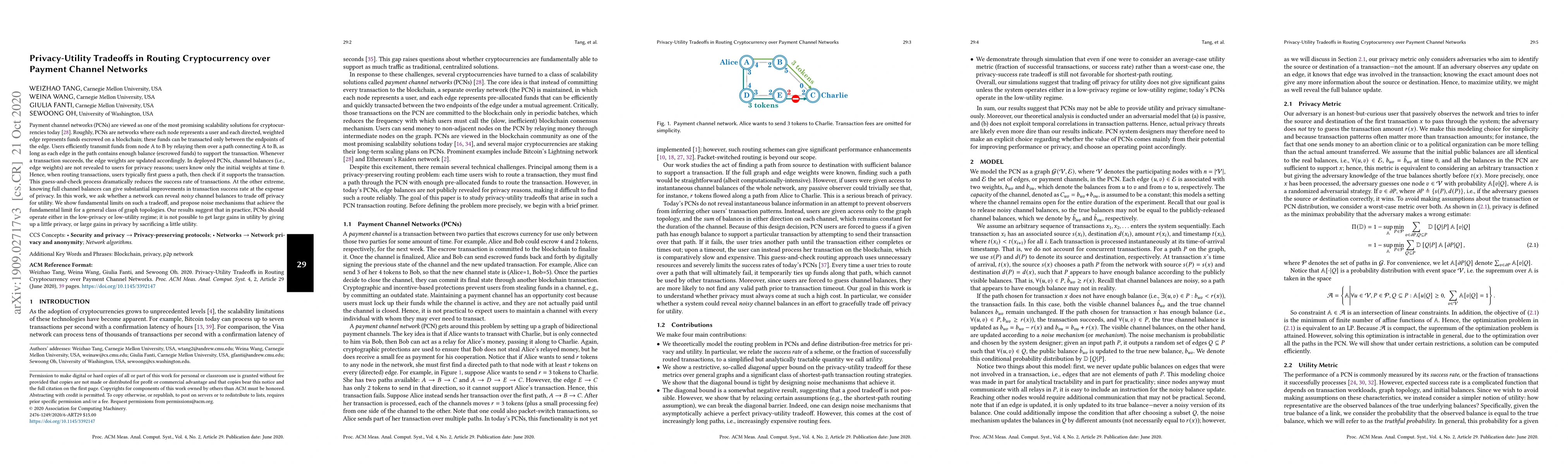 This paper investigates the privacy-utility tradeoffs in routing cryptocurrency over payment channel networks (PCNs), revealing that full knowledge of channel balances improves transaction success rates but compromises user privacy. The study proposes noise mechanisms to balance these aspects, concluding that significant improvements in either privacy or utility are not feasible without substantial sacrifices in the other.
