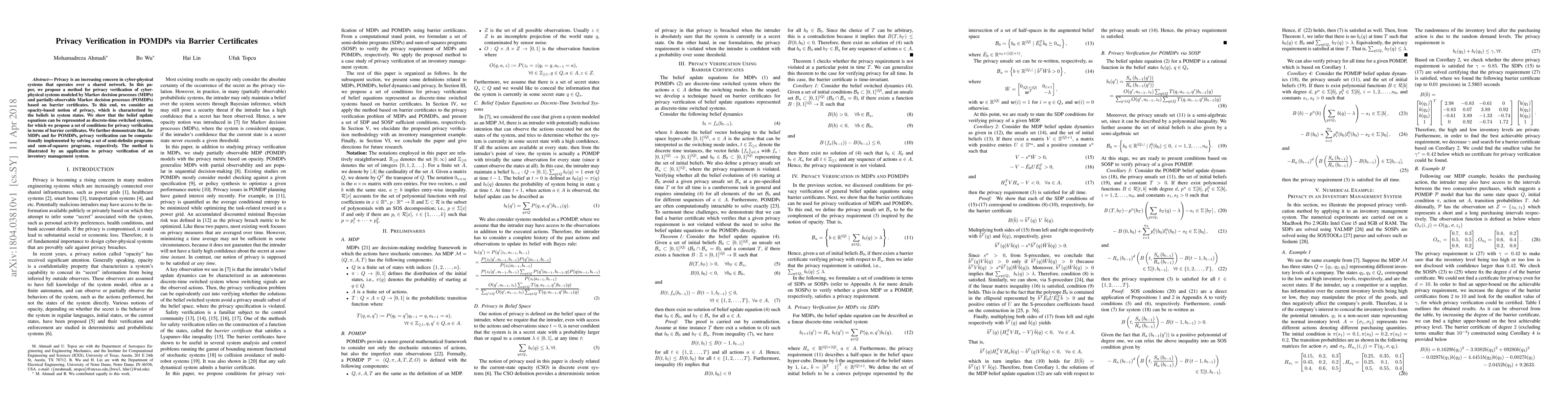 This paper proposes a method for privacy verification in cyber-physical systems modeled by MDPs and POMDPs using barrier certificates. It leverages an opacity-based notion of privacy and demonstrates computational implementation via semi-definite and sum-of-squares programs, illustrated with an inventory management system.