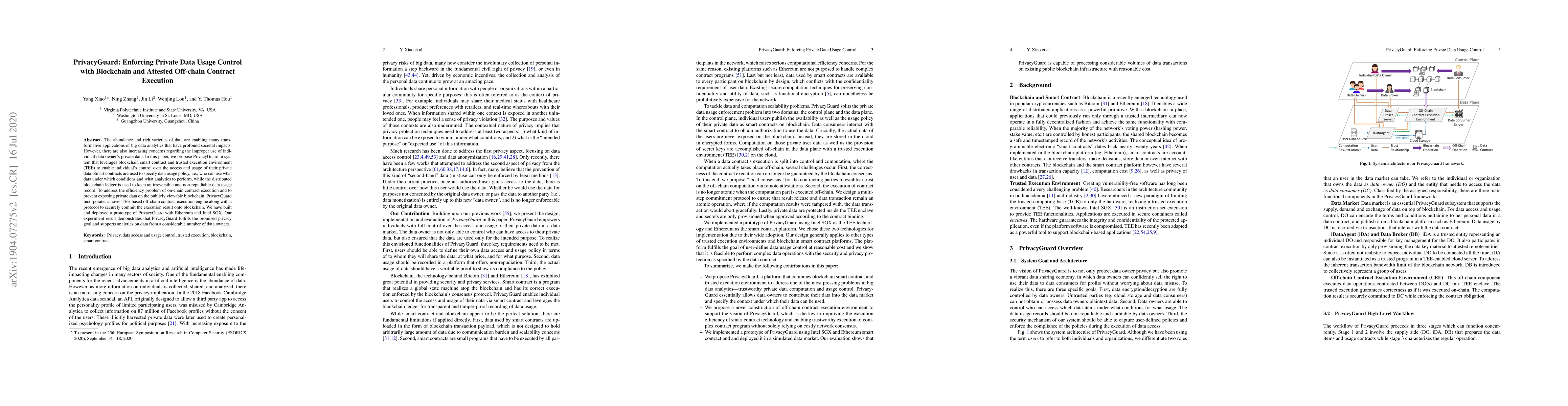 PrivacyGuard leverages blockchain and trusted execution environments to empower individuals to control their private data usage. It uses smart contracts for data access policies and off-chain execution for efficiency, securely committing results to the blockchain to maintain privacy and integrity.