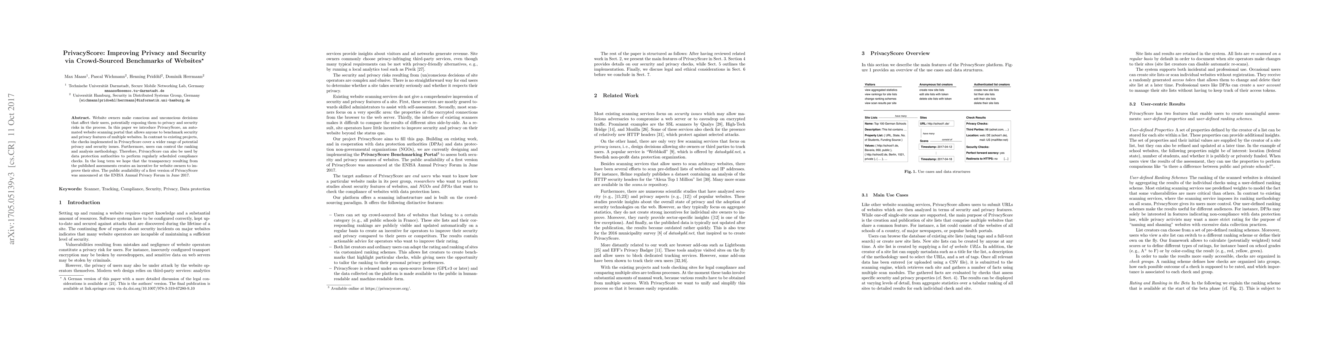 Researchers introduced PrivacyScore, a crowd-sourced website scanning portal that assesses security and privacy features of multiple websites, aiming to improve transparency and encourage website owners to enhance their sites.