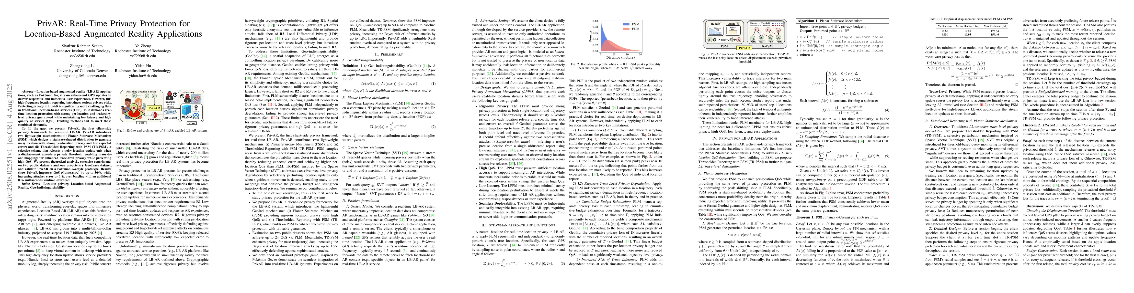 Location-based augmented reality (LB-AR) applications, such as Pok\'emon Go, stream sub-second GPS updates to deliver responsive and immersive user experiences. However, this high-frequency location reporting introduces serious privacy risks. Protecting privacy in LB-AR is significantly more challenging than in traditional location-based services (LBS), as it demands real-time location protection with strong per-location and trajectory-level privacy guaranteed while maintaining low latency and high quality of service (QoS). Existing methods fail to meet these combined demands. To fill the gap, we present PrivAR, the first client-side privacy framework for real-time LB-AR. PrivAR introduces two lightweight mechanisms: (i) Planar Staircase Mechanism (PSM) which designs a staircase-shaped distribution to generate noisy location with strong per-location privacy and low expected error; and (ii) Thresholded Reporting with PSM (TR-PSM), a selective scheme that releases a noisy location update only when a displacement exceeds a private threshold, enabling many-to-one mappings for enhanced trace-level privacy while preserving high QoS. We present theoretical analysis, extensive experiments on two public datasets and our proprietary GeoTrace dataset, and validate PrivAR on a Pok\'emon-Go-style prototype. Results show PrivAR improves QoS (Gamescore) by up to 50%, while increasing attacker error by 1.8x over baseline with an additional 0.06 milliseconds runtime overhead.