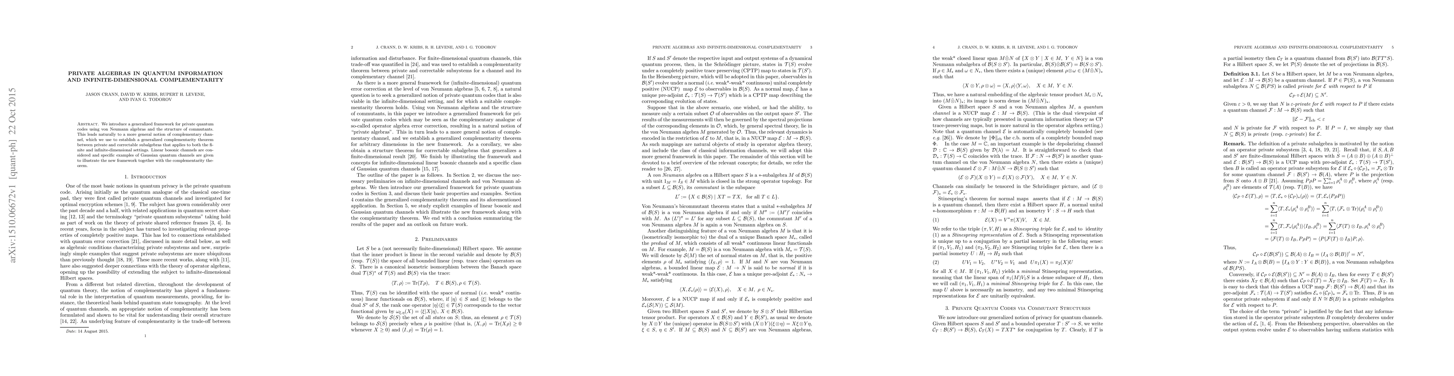 This paper develops a generalized framework for private quantum codes using von Neumann algebras and commutants, establishing a complementarity theorem for private and correctable subalgebras in both finite and infinite-dimensional settings, with applications to Gaussian quantum channels.