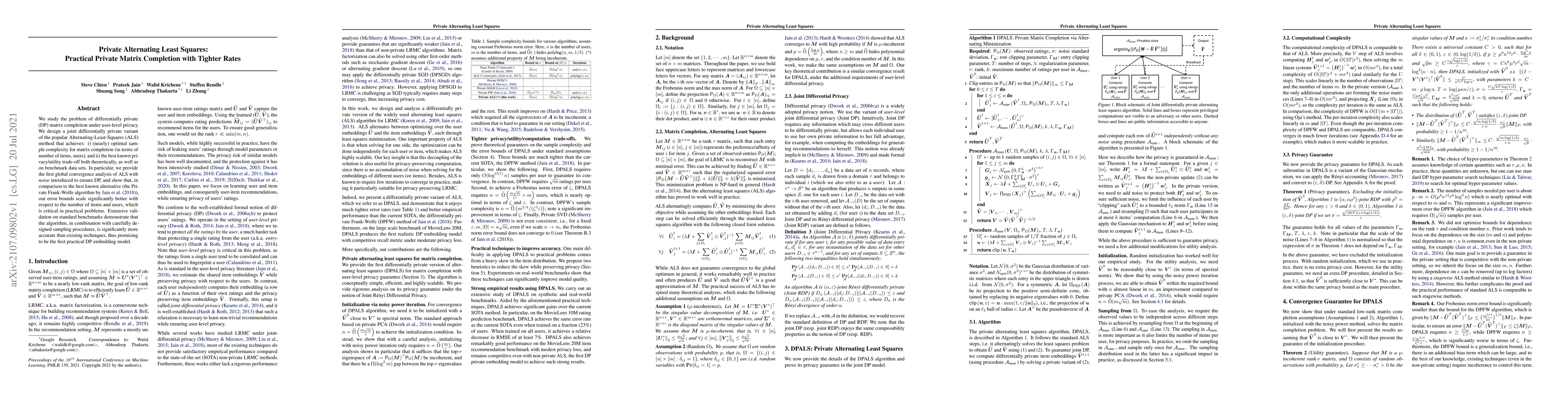 This paper proposes a differentially private variant of the Alternating-Least-Squares method for matrix completion that achieves nearly optimal sample complexity and the best known privacy/utility trade-off. The new method demonstrates superior accuracy and performance compared to existing alternatives, making it a promising practical DP embedding model.