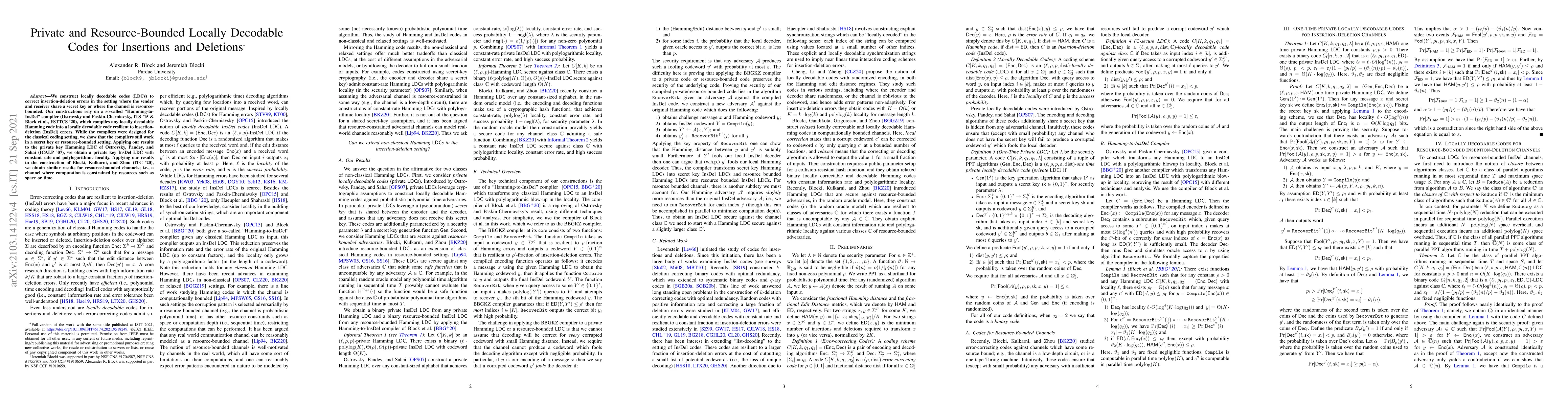 This paper constructs locally decodable codes (LDCs) to correct insertion-deletion errors under private key or resource-bounded settings. The authors utilize a "Hamming-to-InsDel" compiler to adapt existing LDCs for InsDel resilience, achieving constant rate and polylogarithmic locality.