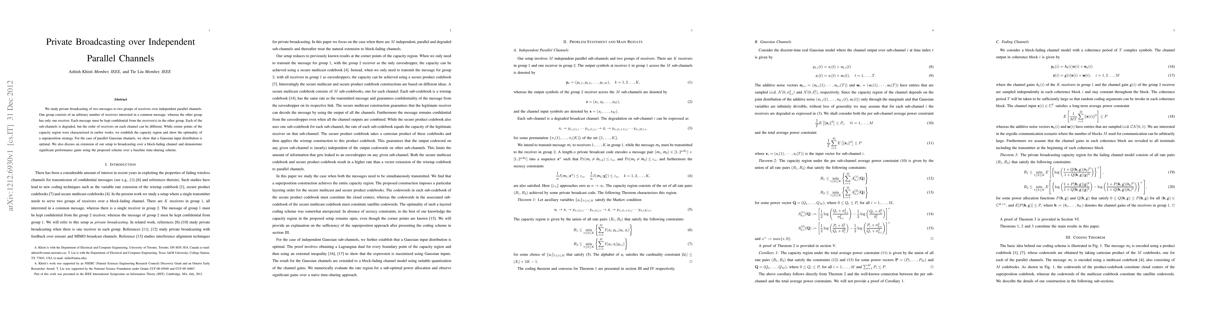 This paper investigates private broadcasting of two confidential messages over independent parallel channels to two distinct receiver groups, establishing the capacity region and demonstrating the optimality of a superposition strategy. For parallel Gaussian channels, it proves that Gaussian input distributions are optimal and extends the setup to block-fading channels, showing performance improvements over time-sharing baselines.
