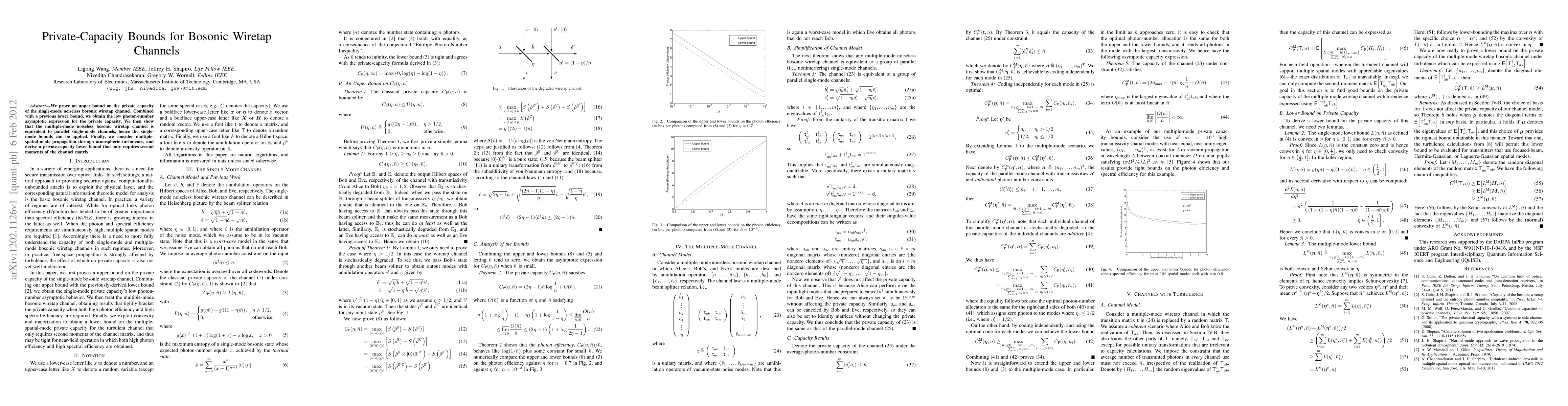 We prove an upper bound on the private capacity of the single-mode noiseless bosonic wiretap channel. Combined with a previous lower bound, we obtain the low photon-number asymptotic expression for the private capacity. We then show that the multiple-mode noiseless bosonic wiretap channel is equivalent to parallel single-mode channels, hence the single-mode bounds can be applied. Finally, we consider multiple-spatial-mode propagation through atmospheric turbulence, and derive a private-capacity lower bound that only requires second moments of the channel matrix.