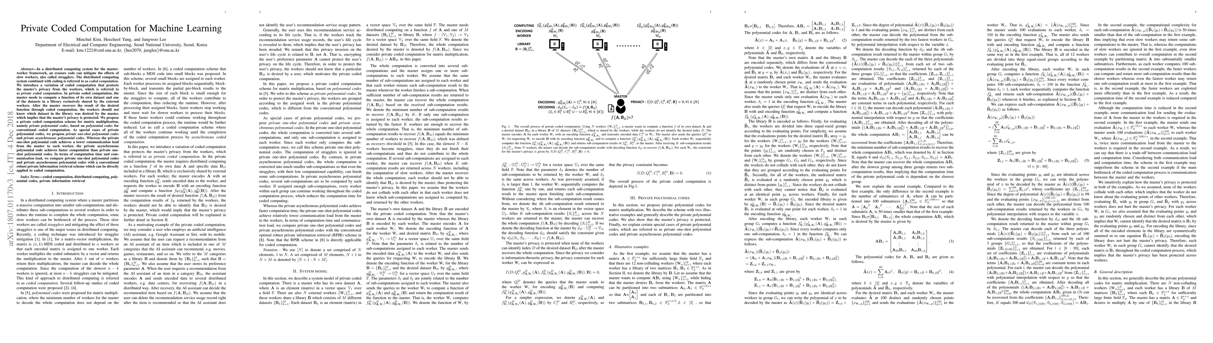 This paper introduces private coded computation to protect the master's privacy in distributed machine learning systems, proposing private polynomial codes for matrix multiplication. It compares private one-shot and asynchronous polynomial codes in terms of communication and computation efficiency against conventional robust private information retrieval schemes.