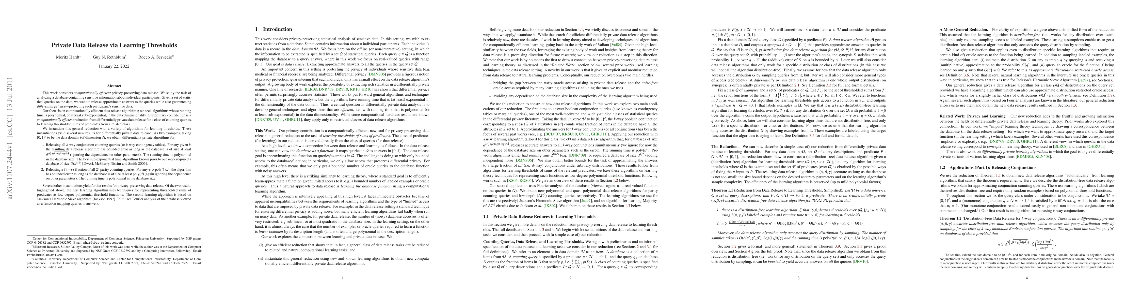 This paper proposes computationally efficient algorithms for differentially private data release, focusing on reducing the problem to learning thresholded sums of predicates. It introduces new results for releasing k-way conjunctions and a (1-\gamma)-fraction of all parity queries with polynomial running times and bounded error under certain database size conditions.