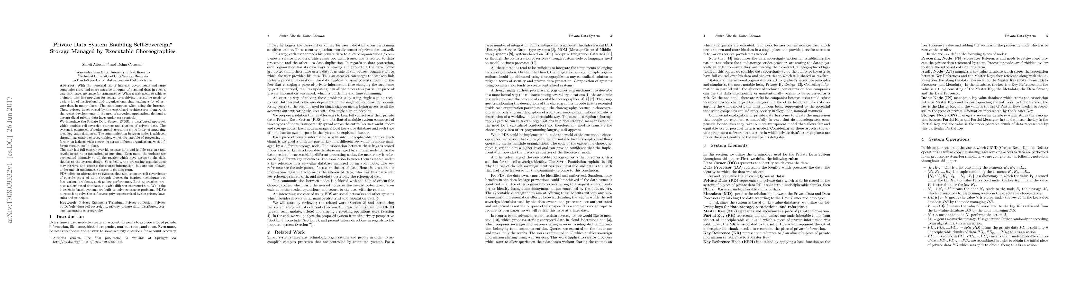 With the increased use of Internet, governments and large companies store and share massive amounts of personal data in such a way that leaves no space for transparency. When a user needs to achieve a simple task like applying for college or a driving license, he needs to visit a lot of institutions and organizations, thus leaving a lot of private data in many places. The same happens when using the Internet. These privacy issues raised by the centralized architectures along with the recent developments in the area of serverless applications demand a decentralized private data layer under user control. We introduce the Private Data System (PDS), a distributed approach which enables self-sovereign storage and sharing of private data. The system is composed of nodes spread across the entire Internet managing local key-value databases. The communication between nodes is achieved through executable choreographies, which are capable of preventing information leakage when executing across different organizations with different regulations in place. The user has full control over his private data and is able to share and revoke access to organizations at any time. Even more, the updates are propagated instantly to all the parties which have access to the data thanks to the system design. Specifically, the processing organizations may retrieve and process the shared information, but are not allowed under any circumstances to store it on long term. PDS offers an alternative to systems that aim to ensure self-sovereignty of specific types of data through blockchain inspired techniques but face various problems, such as low performance. Both approaches propose a distributed database, but with different characteristics. While the blockchain-based systems are built to solve consensus problems, PDS's purpose is to solve the self-sovereignty aspects raised by the privacy laws, rules and principles.