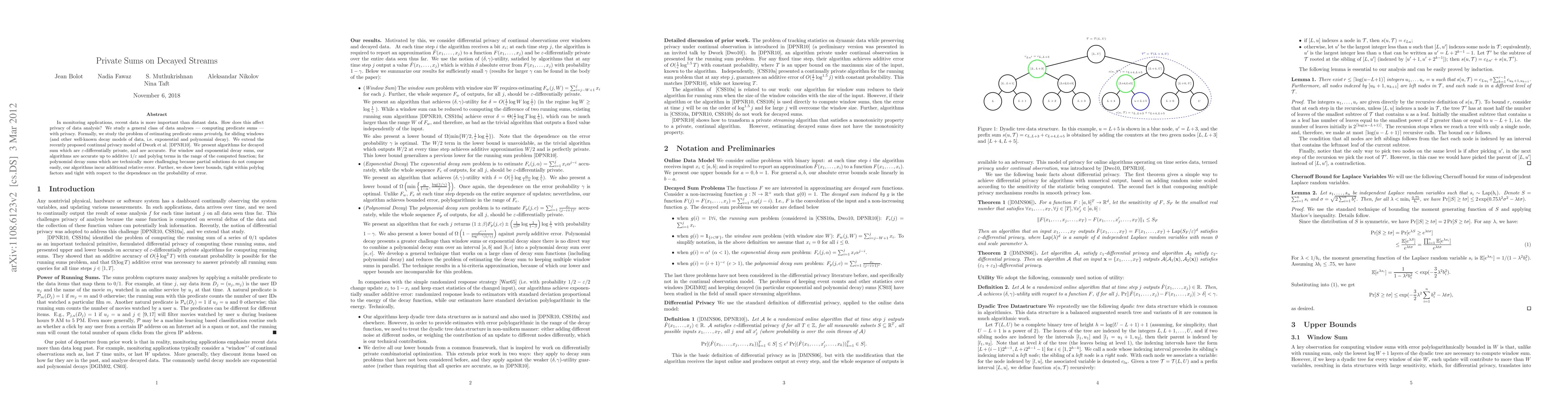 In monitoring applications, recent data is more important than distant data. How does this affect privacy of data analysis? We study a general class of data analyses - computing predicate sums - with privacy. Formally, we study the problem of estimating predicate sums {\em privately}, for sliding windows (and other well-known decay models of data, i.e. exponential and polynomial decay). We extend the recently proposed continual privacy model of Dwork et al. We present algorithms for decayed sum which are $\eps$-differentially private, and are accurate. For window and exponential decay sums, our algorithms are accurate up to additive $1/\eps$ and polylog terms in the range of the computed function; for polynomial decay sums which are technically more challenging because partial solutions do not compose easily, our algorithms incur additional relative error. Further, we show lower bounds, tight within polylog factors and tight with respect to the dependence on the probability of error.