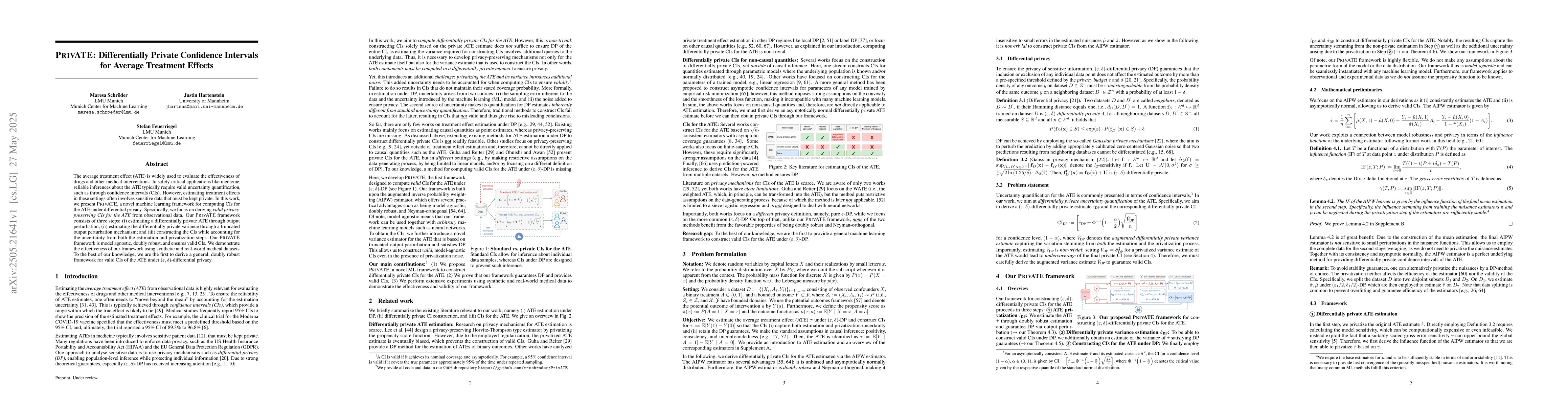 The research introduces PrivATE, a machine learning framework for computing differentially private confidence intervals (CIs) for the average treatment effect (ATE) from observational data. It consists of three steps: (i) estimating a differentially private ATE through output perturbation, (ii) estimating the differentially private variance via a truncated output perturbation mechanism, and (iii) constructing CIs while accounting for uncertainties from both estimation and privatization steps. The framework is model-agnostic, doubly robust, and ensures valid CIs.
