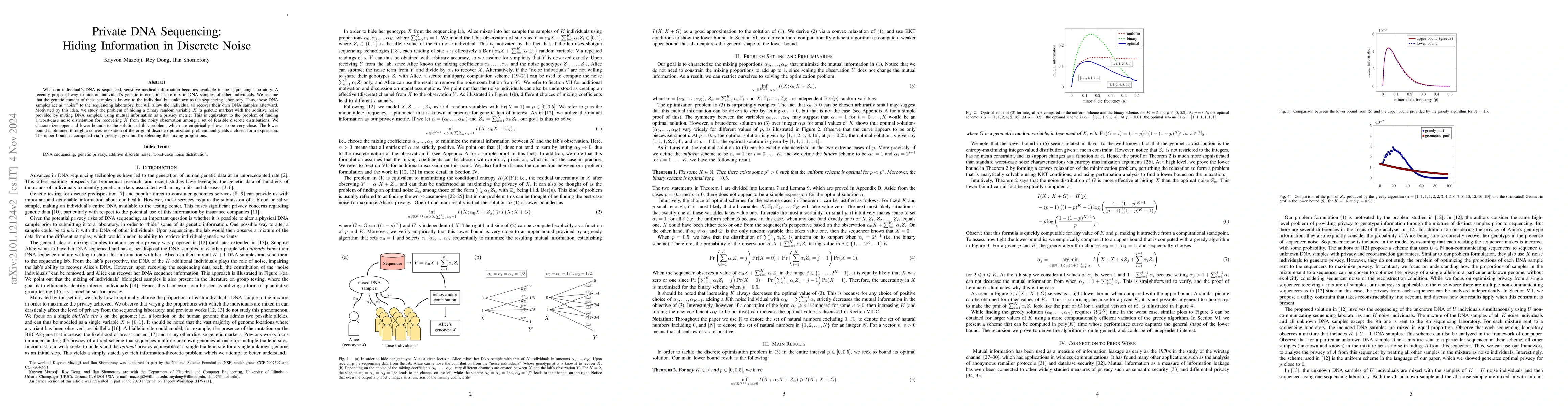 This paper explores a method to hide sensitive genetic information in DNA sequencing by mixing in known DNA samples, acting as "noise" to the lab but allowing the individual to recover their own data. It uses mutual information to measure privacy and finds bounds for optimal noise distribution through a convex relaxation and a greedy algorithm.