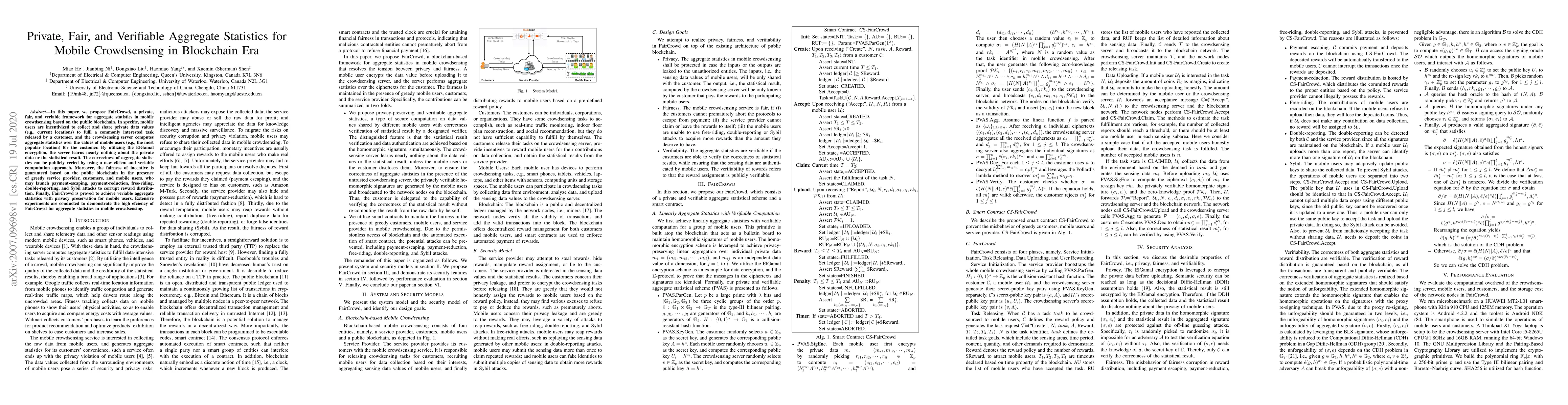 This paper introduces FairCrowd, a blockchain-based framework for private, fair, and verifiable aggregate statistics in mobile crowdsensing. It ensures privacy through ElGamal encryption and guarantees fairness via the public blockchain, while enabling efficient public verification of computed statistics.
