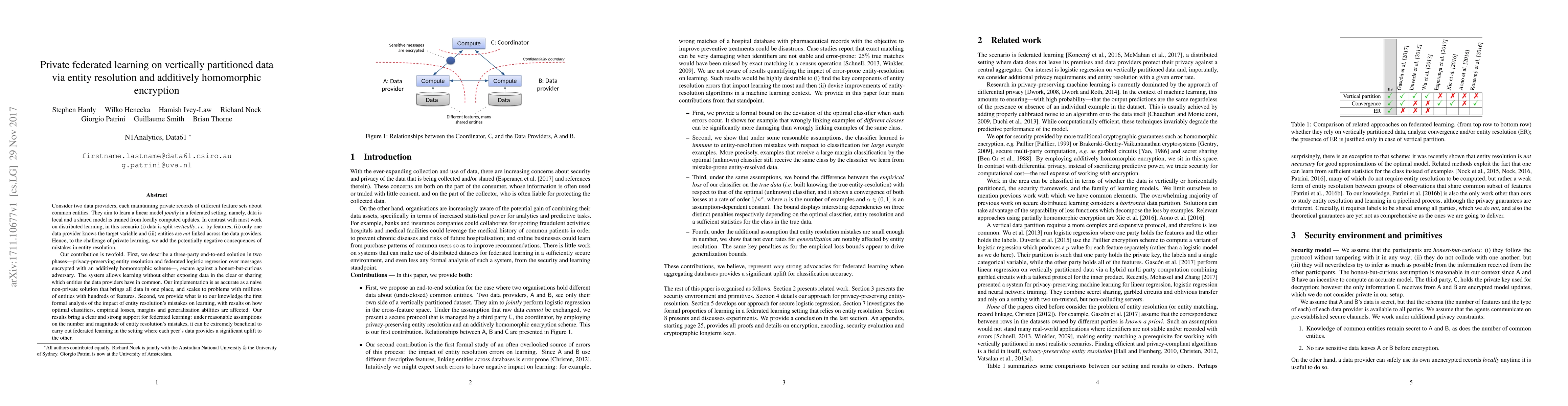 Consider two data providers, each maintaining private records of different feature sets about common entities. They aim to learn a linear model jointly in a federated setting, namely, data is local and a shared model is trained from locally computed updates. In contrast with most work on distributed learning, in this scenario (i) data is split vertically, i.e. by features, (ii) only one data provider knows the target variable and (iii) entities are not linked across the data providers. Hence, to the challenge of private learning, we add the potentially negative consequences of mistakes in entity resolution. Our contribution is twofold. First, we describe a three-party end-to-end solution in two phases ---privacy-preserving entity resolution and federated logistic regression over messages encrypted with an additively homomorphic scheme---, secure against a honest-but-curious adversary. The system allows learning without either exposing data in the clear or sharing which entities the data providers have in common. Our implementation is as accurate as a naive non-private solution that brings all data in one place, and scales to problems with millions of entities with hundreds of features. Second, we provide what is to our knowledge the first formal analysis of the impact of entity resolution's mistakes on learning, with results on how optimal classifiers, empirical losses, margins and generalisation abilities are affected. Our results bring a clear and strong support for federated learning: under reasonable assumptions on the number and magnitude of entity resolution's mistakes, it can be extremely beneficial to carry out federated learning in the setting where each peer's data provides a significant uplift to the other.