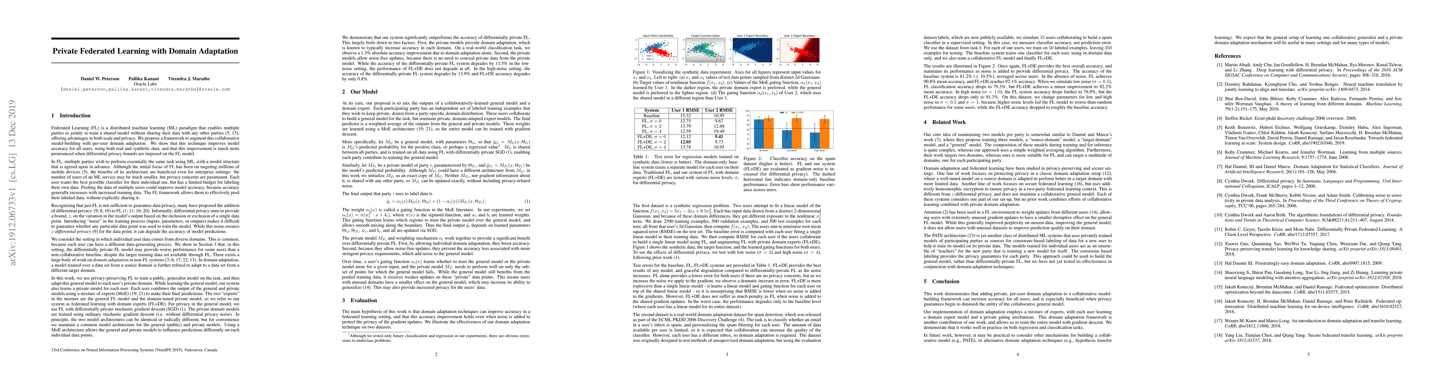 This paper introduces a framework for Private Federated Learning with Domain Adaptation, improving model accuracy for all users using real and synthetic data while maintaining differential privacy.